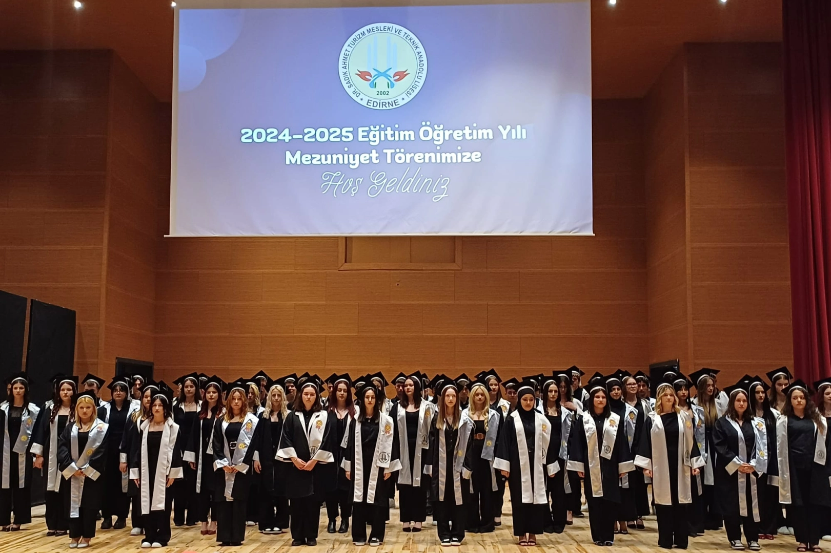 Edirne'de Atatürk Kültür Merkezi'nde, Dr. Sadık Ahmet Turizm Mesleki ve Teknik Anadolu Lisesi mezuniyet töreni gerçekleştirildi. Yeni hayatlarına ilk adımlarını atacak öğrenciler, mezuniyet heyecanı yaşadı.