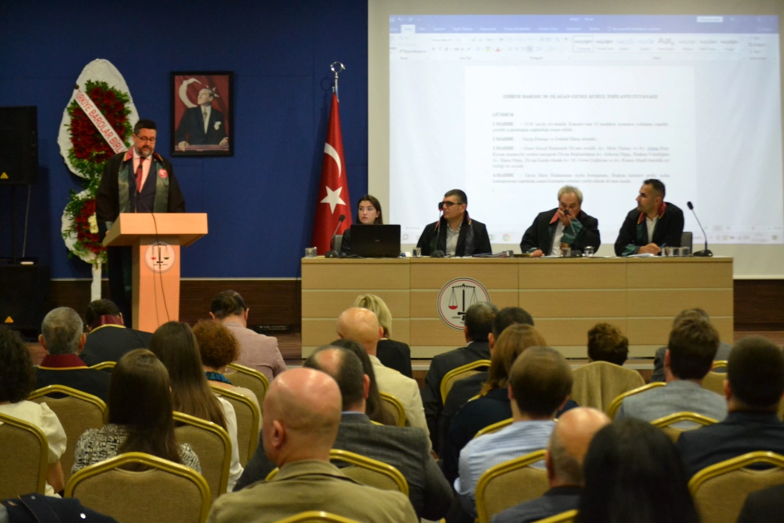 Genel kurul ile ilgili basın mensuplarına açıklama yapan Edirne Baro Başkanı Av. Gökhan Karakoç, Edirne Barosu’nun 101 yaşında olduğuna dikkat çekerek; “Edirne Barosu, 1923 kuruluşlu, Cumhuriyetimizle yaşıt bir hukuk kurumudur. 101’inci yaşını idrak ediyoruz. 50’nci genel kurul için yeniden bir aradayız. Edirne Barosu, Kuvayi Milliye kahramanı bir kurucu başkanı olan barodur. Av. Hayrettin Belli’nin ruhu şad olsun. Edirne Barosu her zaman hukukun, adaletin bekçisi ve öncüsü olmuştur. Her zaman yurttaşın hak arama hürriyetinin teminatı olan avukatların çatı örgütü olmuştur. Bu misyonla 101 yıldır yoluna azim ve kararlılıkla devam etmektedir. Edirne Barosu, yeni dönemde oluşacak yönetimle de Atatürk devrimlerinden, Cumhuriyet kazanımlarından bir milim geri kalmaksızın yolunu kararlılıkla sürdürme azmindedir. 50’nci genel kurulun, başta aday meslektaşlarım olmak üzere baromuza, meslektaşlarımıza, tüm hukuk camiasına hayırlı olmasını diliyorum” ifadelerini kullandı.