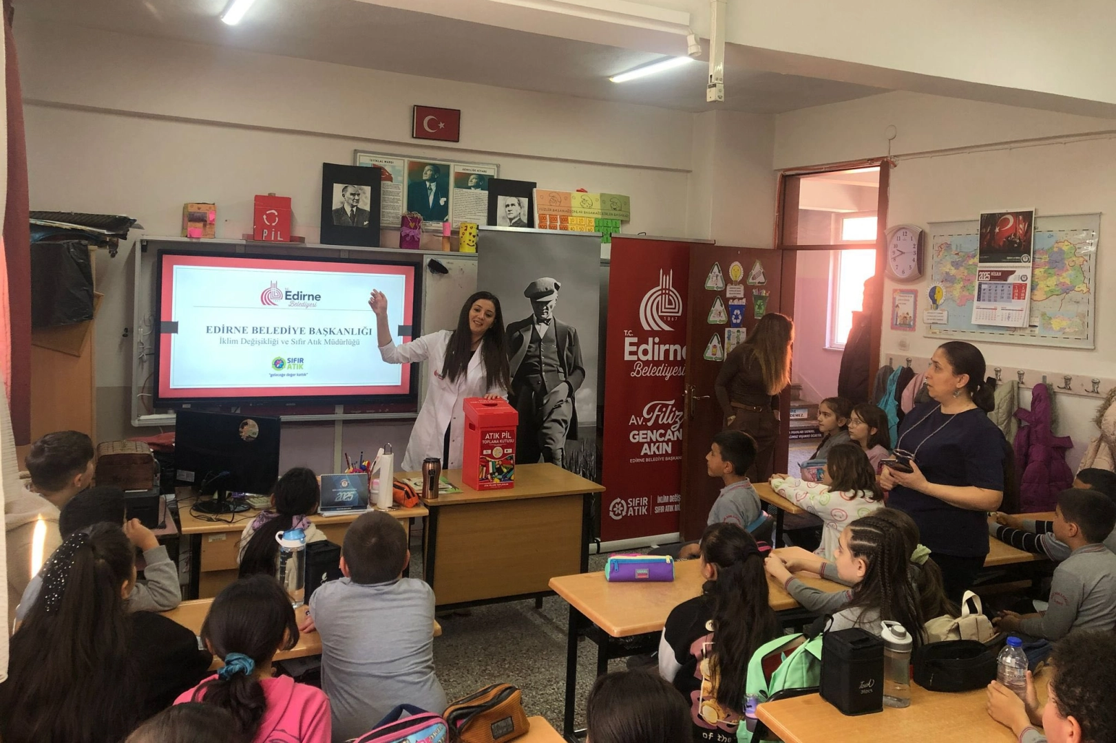 Edirne Belediyesi İklim Değişikliği ve Sıfır Atık Müdürlüğü tarafından yürütülen eğitim faaliyetleri kapsamında, kentteki öğrencilere çevre bilinci, iklim değişikliği, sıfır atık, su tasarrufu ve geri dönüşüm konularında farkındalık kazandırmak amacıyla bilgilendirme çalışmaları gerçekleştiriliyor.