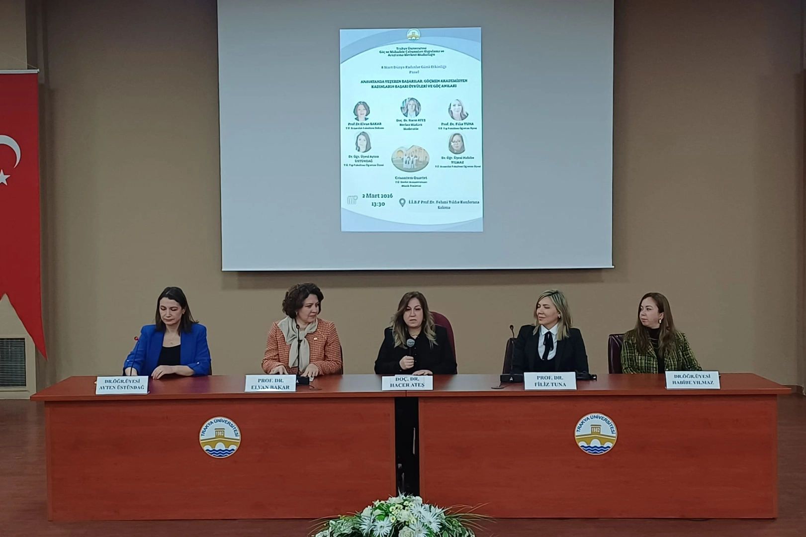 Trakya Üniversitesi Göç ve Mübadele Çalışmaları Uygulama ve Araştırma Merkezi tarafından 8 Mart Dünya Kadınlar Günü kapsamında düzenlenen “Anavatanda Yeşeren Başarılar: Göçmen Akademisyen Kadınların Başarı Öyküleri ve Göç Anıları” başlıklı panel, İİBF Prof. Dr. Fehmi Yıldız Konferans Salonu’nda gerçekleştirildi. Panelin moderatörlüğünü Merkez Müdürü Hacer Ateş üstlenirken, Elvan Bakar, Filiz Tuna, Ayten Üstündağ ve Habibe Yılmaz panelist olarak yer aldı. Programda ayrıca Crisantem Quartet tarafından müzik dinletisi sunuldu.