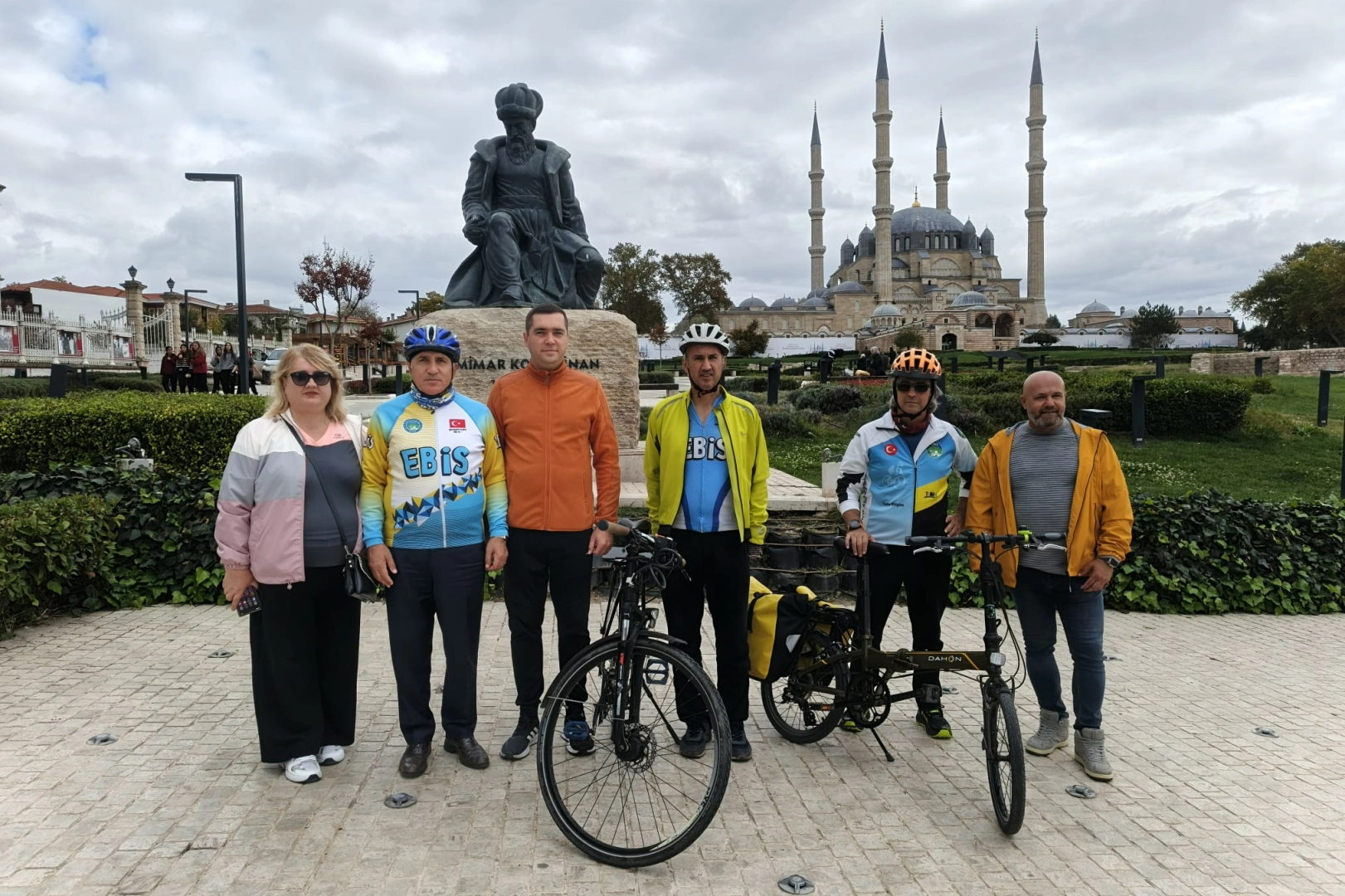 Selimiye Camii meydanındaki Mimar Sinan heykeli önünde düzenlenen basın açıklamasına EBİS Başkanı Sadi Çalışkan, Başkan Yardımcısı Mustafa Kurt, Bisiklet İl Temsilcisi Utku Zorlutuna ve dernek üyeleri katıldı.