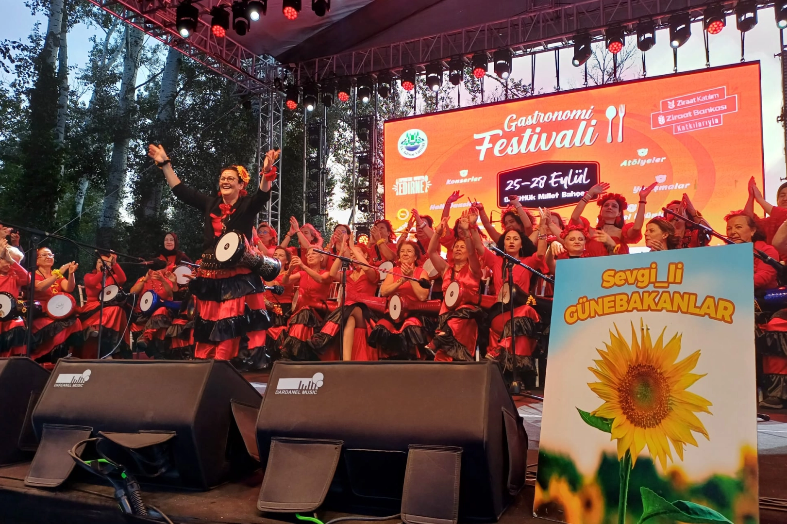 Topraktan Sofraya Edirne Gastronomi ve Yaşayan Miras Festivali kapsamında sahnede renkli anlar yaşandı. Ana sahnede ilk olarak “9/8’lik Eğlence” konseriyle Sevgili Günebakanlar Darbuka Topluluğu izleyicilere coşkulu bir ritim şöleni sundu.