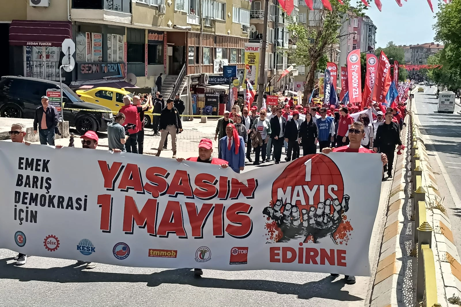 Edirne'de 1 Mayıs Emek ve Dayanışma Günü kutlamaları kapsamında konfederasyonlar, sendikalar, siyasi partiler, odalar ve sivil toplum örgütleri tarafından oluşturulan 1 Mayıs korteji yürüyüşe başladı.