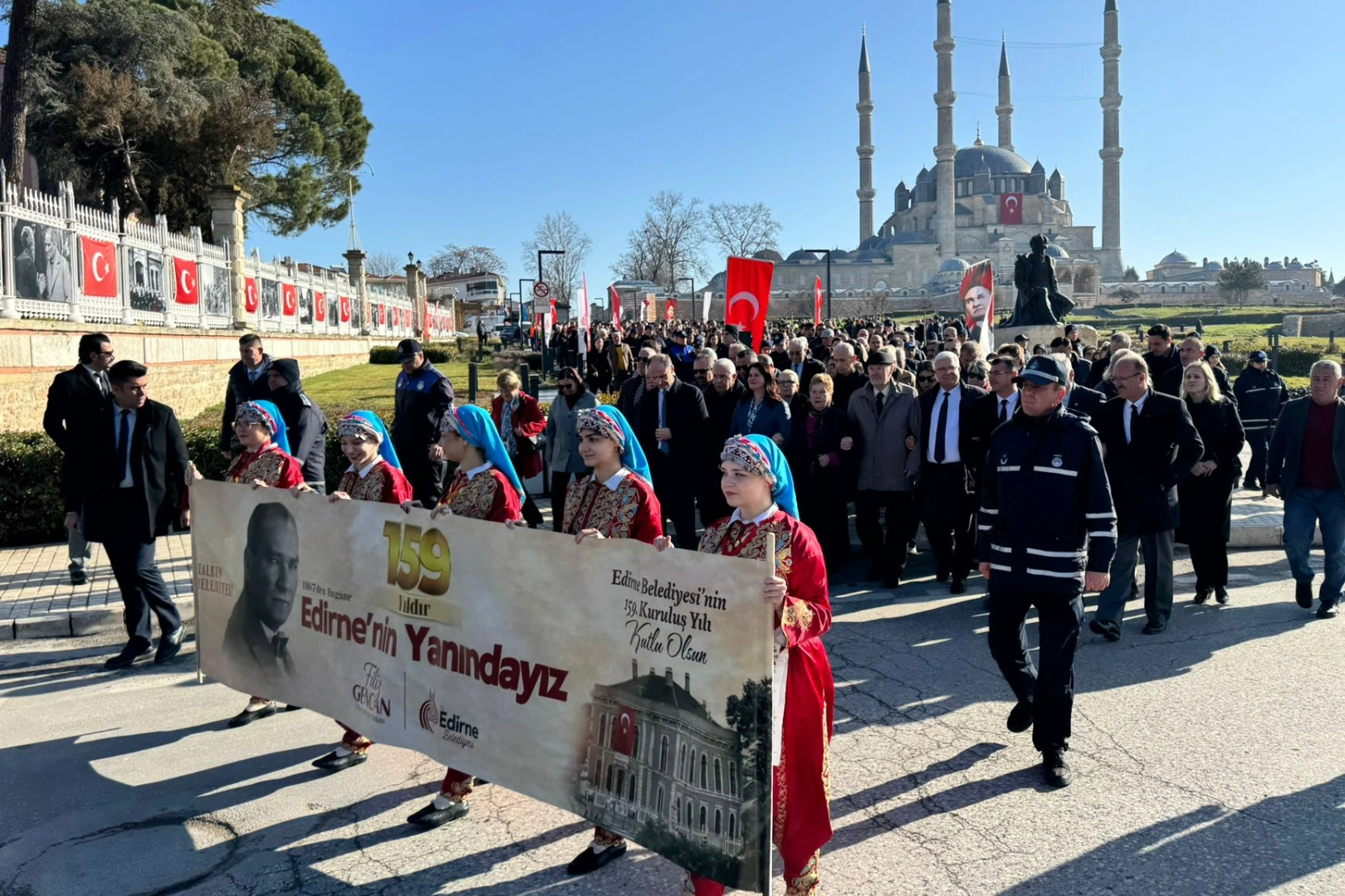 Edirne Belediyesi’nin kuruluşunun 159. yıl dönümü kutlamaları, kentte bayram havası estirdi. Belediye bandosunun çaldığı marşlar eşliğinde, belediye binasından Atatürk Anıtı’na kadar uzanan görkemli bir kortej yürüyüşü gerçekleştirildi.