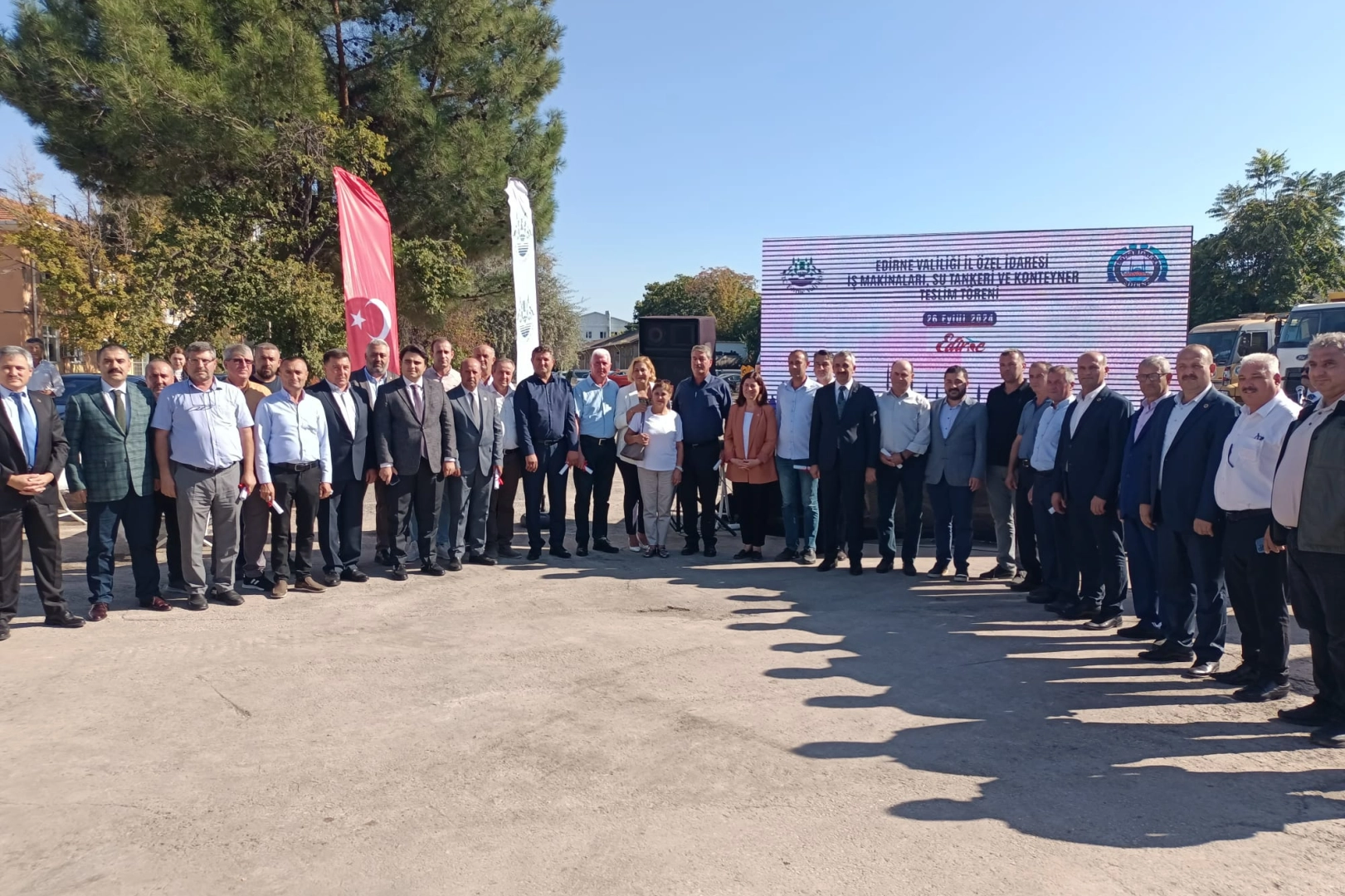 Edirne Valiliği İl Özel İdaresi tarafından temin edilen iş makineleri, su tankerleri ve çöp konteynerlerinin il genelindeki 22 köye teslim edilmesi töreni gerçekleştirildi.