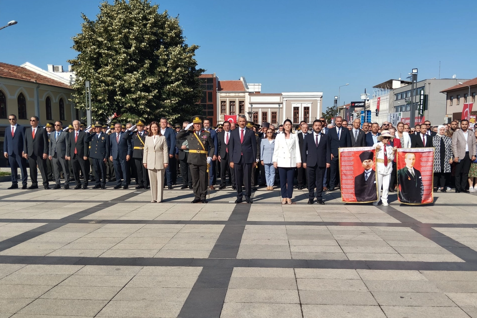 Edirne Valisi Yunus Sezer, Garnizon Komutanı Tuğgeneral Yüksel Kolcu ve Belediye Başkanı Av. Filiz Gencan Akın'ın Atatürk anıtına çelenk sunması ile başlayan törende Edirne Belediye Bandosu eşliğinde Türkiye Cumhuriyeti'nin kurucusu Mustafa Kemal Atatürk, silah arkadaşları ve tüm şehitler anısına bir dakikalık saygı duruşunda bulunularak, İstiklal marşı okundu. Saygı duruşu sırasında Edirne'de hayat bir dakikalığına dururken; anıt çevresinde bulunan vatandaşların İstiklal marşına da coşkuyla eşlik ettikleri görüldü.