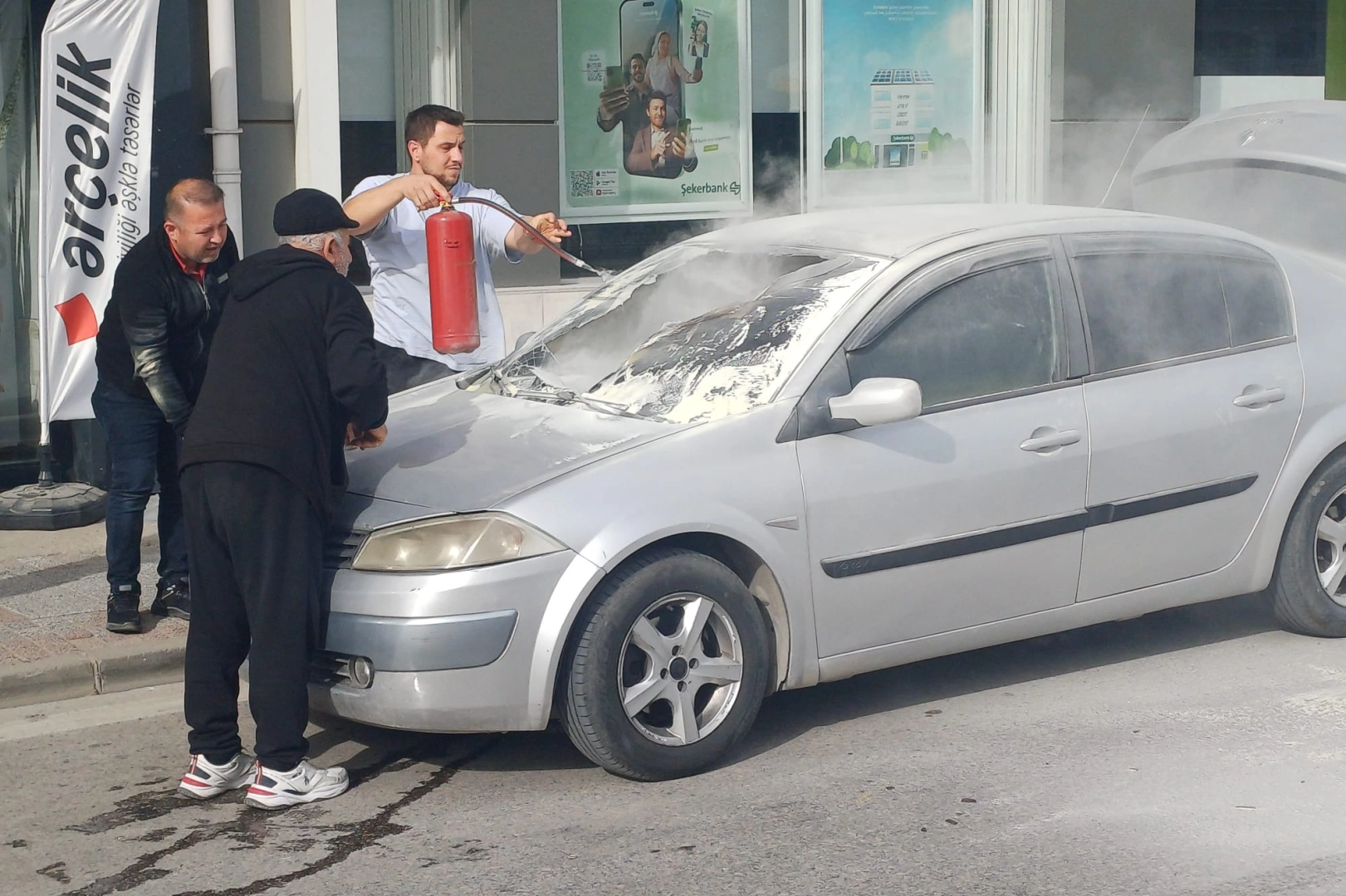 Edirne’de sahibinin alışveriş yapmak için park ettiği otomobil bilinmeyen bir nedenle alev aldı. Çevredeki esnafın söndürdüğü otomobilde maddi hasar meydana geldi.