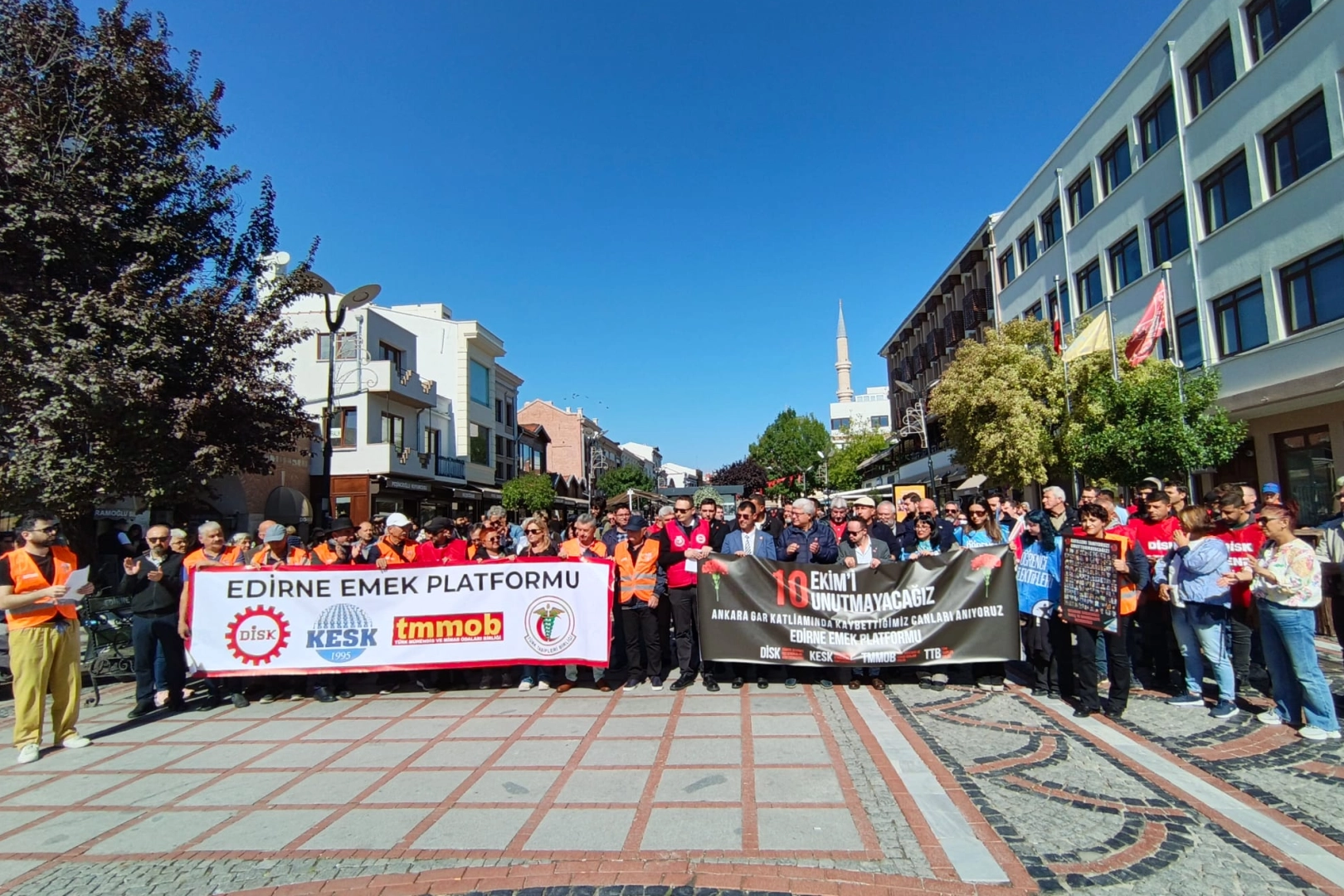 Edirne’de DİSK, KESK, TMMOB ve TTB tarafından oluşturulan Edirne Emek Platformu, 10 Ekim Ankara Gar Katliamı’nın 10’uncu yılında hayatını kaybedenleri anmak için basın açıklaması yaptı.
