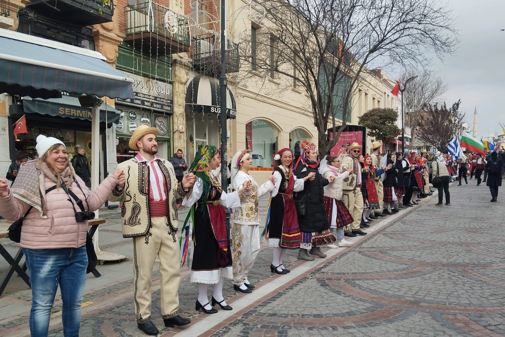 8 Balkan ülkesinden 22 halkoyunları topluluğunun katıldığı festivalde bugün tüm topluluklar Selimiye Meydanı’nda bir araya geldi. Selimiye meydanında toplan halkoyunları toplulukları, Edirne Belediye bandosu eşliğinde Saraçlar Caddesi’ne kortej yürüyüşü gerçekleştirdi. Edirne Belediye Başkanı Filiz Gencan Akın ve Trakya Üniversitesi Rektörü Prof. Dr. Mustafa Hatipler’in de katıldığı kortej yürüyüşüne Saraçlar Caddesi’ndeki vatandaşlar büyük ilgi gösterdi. Saraçlar Caddesinin Zindanaltı mevkiinde kısa bir gösteri sunan halkoyunları toplulukları, daha sonra Edirne Belediye Bandosu’nun Balkan müzikleri eşliğinde hep birlikte uzun bir halay oluşturdular.