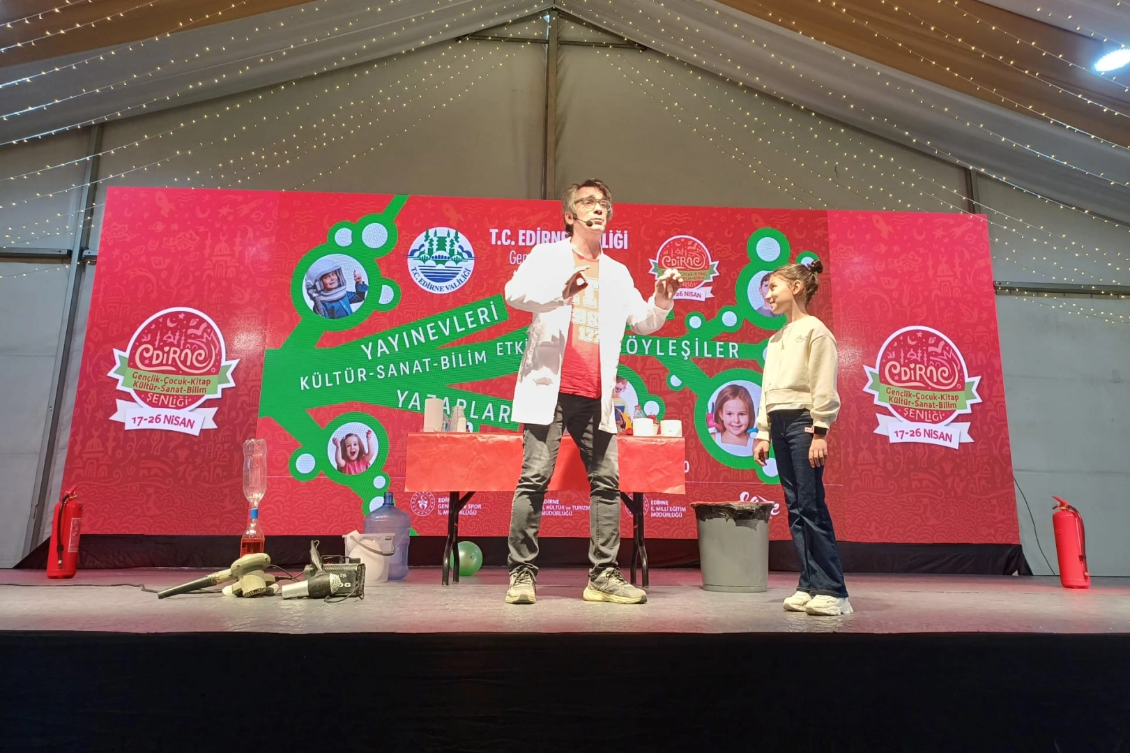 Edirne’de düzenlenen “Gençlik, Çocuk, Kitap, Sanat ve Bilim Şenliği” kapsamında gerçekleştirilen bilim gösterisi, çocuklara hem eğlenceli hem de öğretici anlar yaşattı. Tiyatrocu Ozan Erbak’ın sahne performansı eşliğinde gerçekleştirilen etkinlikte çocuklar, bilimi sadece izlemekle kalmadı, sahneye çıkarak deneylerin bir parçası oldu. Renkli gösteriler ve interaktif deneyler sayesinde çocuklar, bilimsel kavramları eğlenerek öğrenme fırsatı buldu.