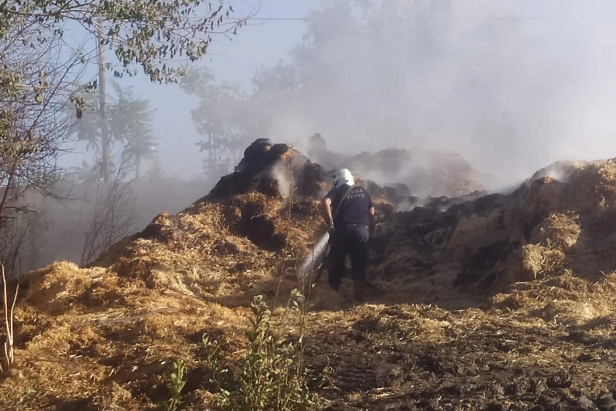 Ekiplerin müdahalesiyle söndürülen yangında yaklaşık 500 balya saman zarar gördü.