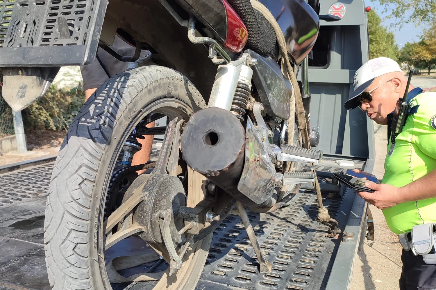 Sürücüye "ehliyetsiz motosiklet kullanmak", "dur ihtarına uymamak", "abartı egzoz kullanmak", "resmi belgeyi bozmak" ve "kask takmamak" maddelerinden 50 bin 546 lira ceza kesildi.