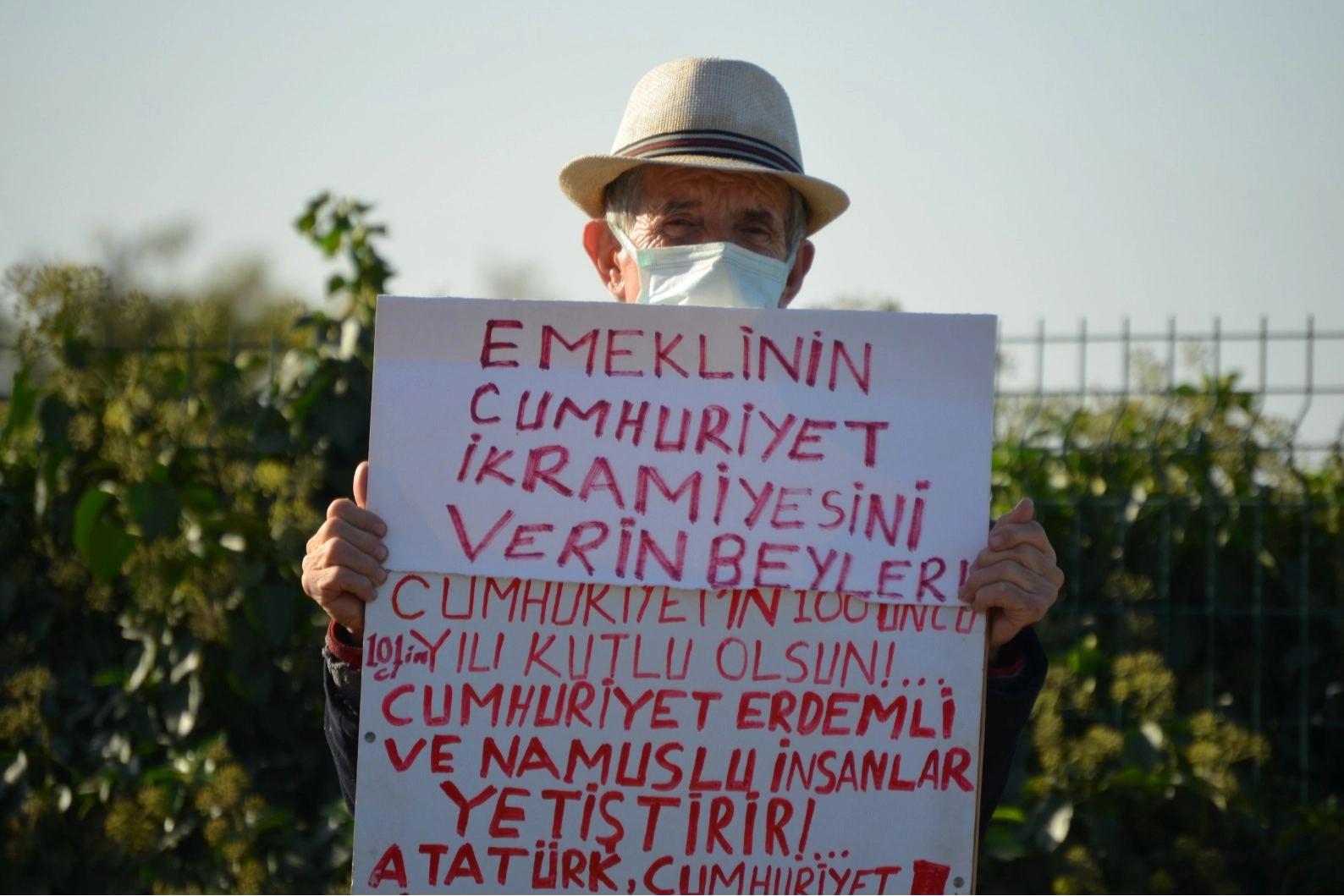 Yirmibeşler, “Geçtiğimiz yıl Türkiye Cumhuriyeti’nin 100’üncü yılında emekli ikramiyeleri verilmişti ama bu yıl verilmedi. O yüzden bu pankartı açma ihtiyacı duydum. Geriye dönüp baktığımızda her geçen gün ürünlere zam geliyor. Aldığımız paranın bir anlamı yok. Biz de meydanlarda elimizden geleni yapmak istiyoruz” şeklinde konuştu.