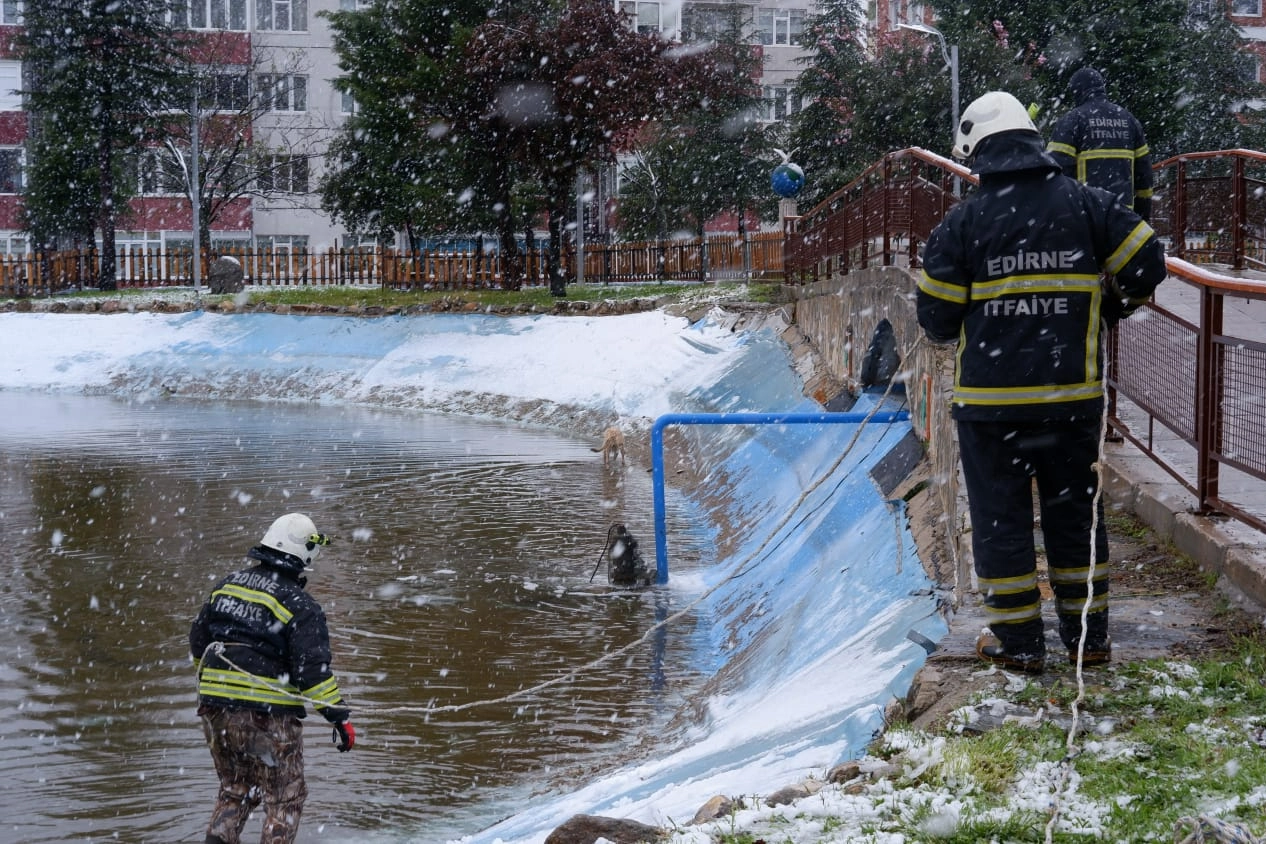 Köpeğin çaresizce kurtarılmak için mücadele ettiğini gören vatandaşlar, Edirne Belediyesi İtfaiye Müdürlüğüne ihbarda bulundu.
