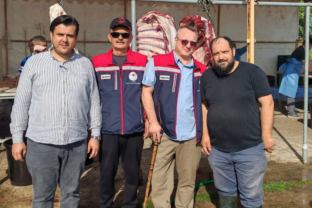 Denetimlerde hijyen koşulları incelendi. Kesim yapan kasaplar, hijyen kuralları konusunda bilgilendirildi.