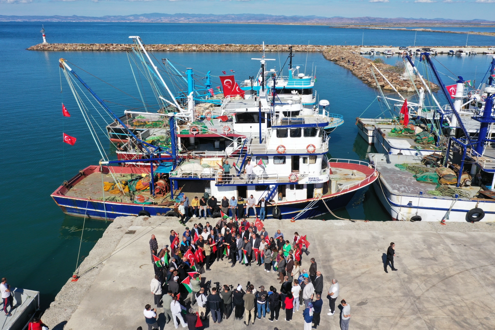 Edirne Valiliğince Enez Limanı'nda düzenlenen etkinlik kapsamında limandaki tekneler Türk ve Filistin bayraklarıyla donatıldı.