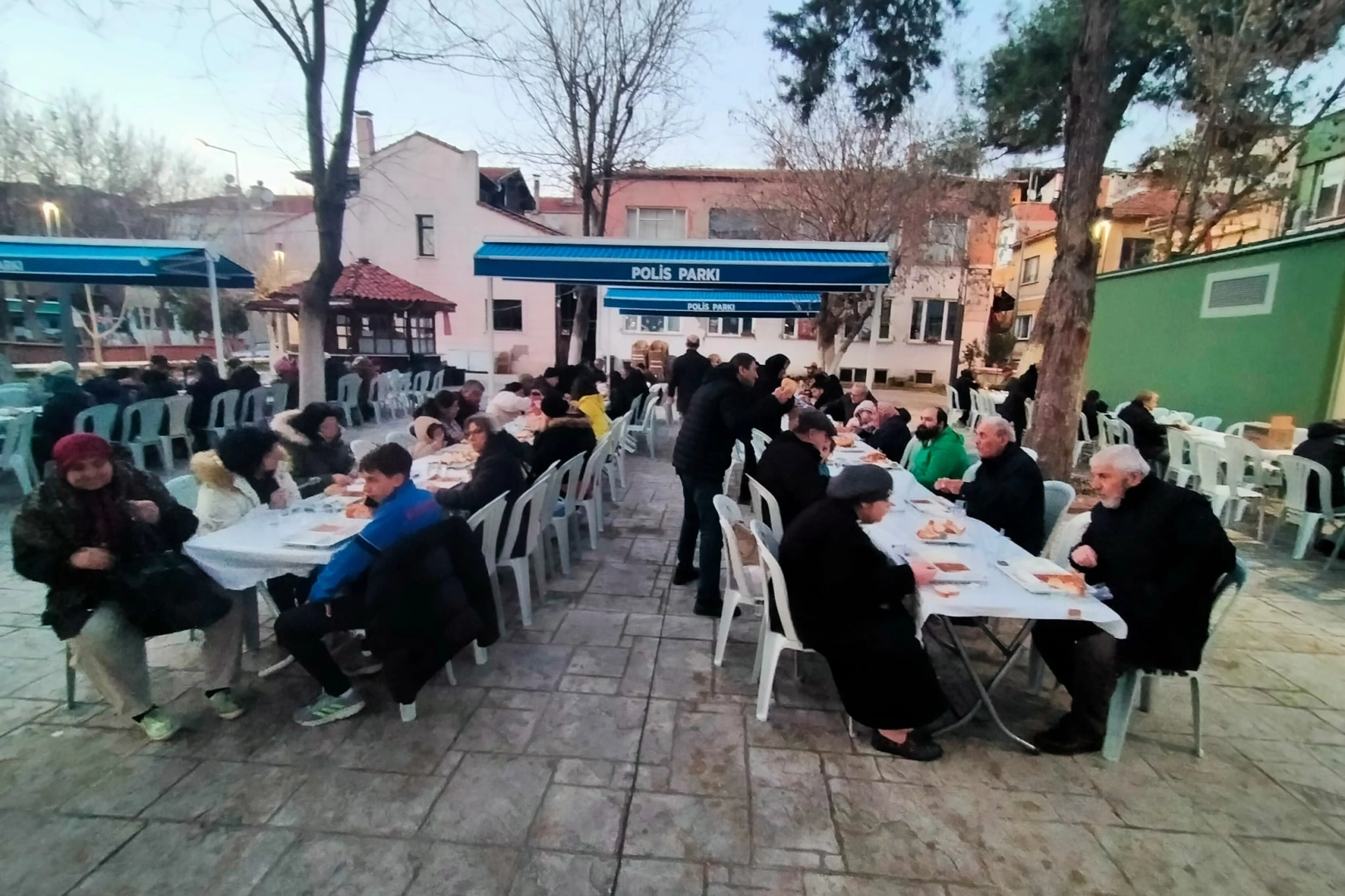Polis parkı bahçesinde kurulan iftar sofrasına katılan vatandaşlar, belediyenin mobil mutfak TIR’ından servis edilen iftarlıkları alıp masaya oturdular.