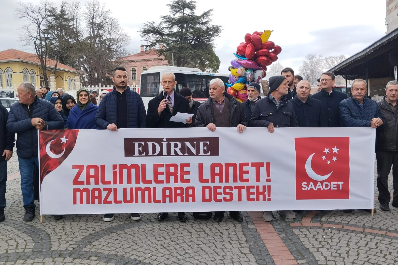 "Zalimlere Lanet, Mazlumlara Destek" konulu, Eski Cami önünde düzenlenen basın açıklamasını Saadet Partisi Edirne İl Başkanı Tezcan Karakütük okudu. Karakütük açıklamasında taraflarının belli olduğunu belirterek “Bugün burada sadece bir basın açıklaması yapmak için değil; başta İslam coğrafyası olmak üzere dünyanın dört bir yanını saran zulüm ateşine karşı birer İbrahimi damla olmak ve mazlumun kimliğine bakmaksızın onunla omuz omuza durduğumuzu tüm dünyaya ilan etmek için toplandık. Milli Görüş hareketi olarak bizler, tarih boyunca olduğu gibi bugün de coğrafya, mezhep ve kimlik ayrımı yapmaksızın zalimin karşısında elif gibi dimdik duruyoruz. Aylardır dünyanın gözü önünde, tarihin kaydedebileceği en vahşi, en alçak soykırımlardan biri Gazze'de işlenmektedir. Bebeklerin süt kokusuna barut kokusunun karıştığı, annelerin feryadının arşı titrettiği bu mübarek topraklar, bugün sözde modern dünyanın sahte ‘insan hakları’ maskesinin düştüğü yerdir. Gazze bugün sadece bir coğrafi bölge değil, imanın, direnişin ve topyekün insanlık onurunun son kalelerinden biridir. Şunu herkes bilsin ki; Gazze'de dökülen her damla kan, bu zulme sessiz kalanların vicdanına sürülmüş kara bir lekedir. Bu katliam durana, abluka tamamen kalkana dek durmayacağız, susmayacağız. Gazze'deki vahşet son bulana dek, Mescid-i Aksa'yı çevreleyen zincirler kırılana dek, Emperyalizmin kirli eli coğrafyamızdan çekilene dek, mücadelemiz, azmimiz ve kararlılığımız artarak devam edecektir. Bizler provokasyonlara gelmeden, vakar ve sükunet içerisinde, birleştirici bir dille haykırıyoruz: Zulüm ile abat olanın ahiri berbat olur. Buradan tüm dünyaya sesleniyoruz. Mazlumların gözyaşı, zalimlerin saltanatını mutlaka yıkacaktır. Kudüs'ün özgürlüğü ve İslam coğrafyasının selameti için bütün gücümüzle çalışmaya, hakkı ve hakikati haykırmaya devam edeceğiz. Zafer inananlarındır ve zafer yakındır” dedi.