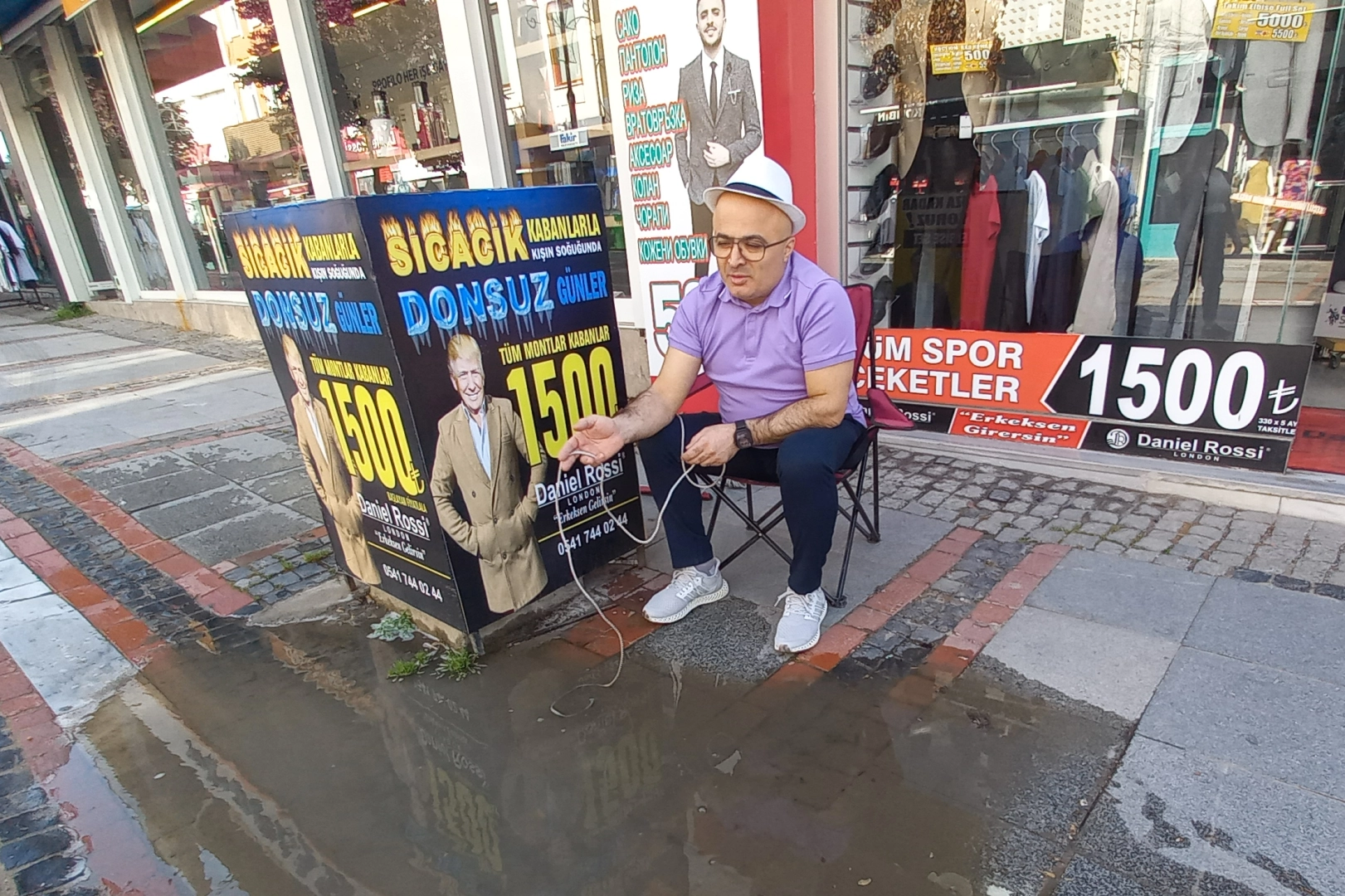 Saraçlar Caddesi'nde yağan her yağmur ve kapılarının önünü yıkayan diğer esnafların suyunun biriktiği Metin Barmanbay, yaşadıklarına Edirne Belediyesi tarafından çözüm bulamayınca mizansen olarak biriken suda balık tutarak derdini bir yerlere anlatmaya çalıştı.