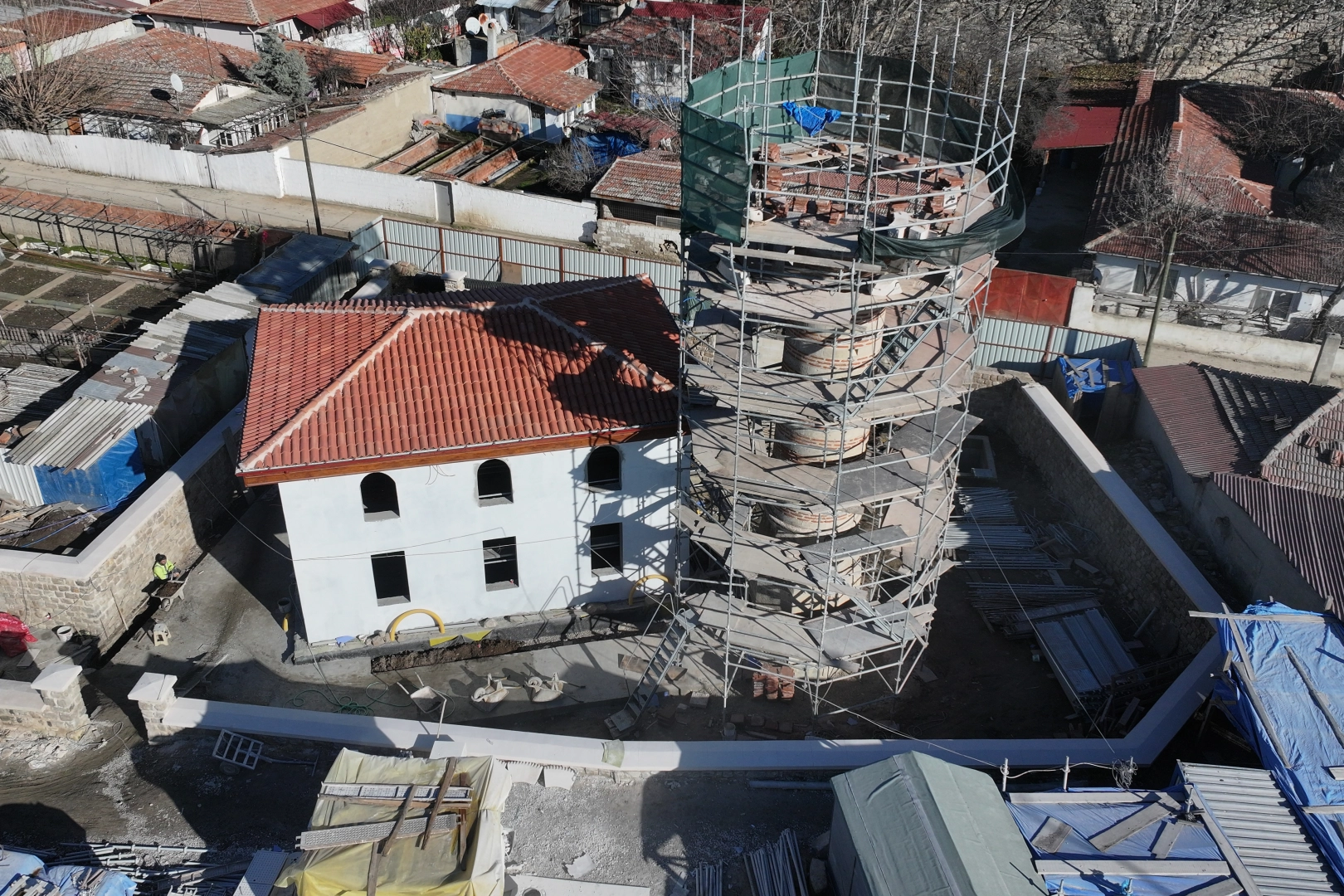 Kazı çalışmalarının ardından ekipler, çevre duvarlarının yapımına başlarken yarısı yıkık minarenin tamamlanması için iskele kurdu.