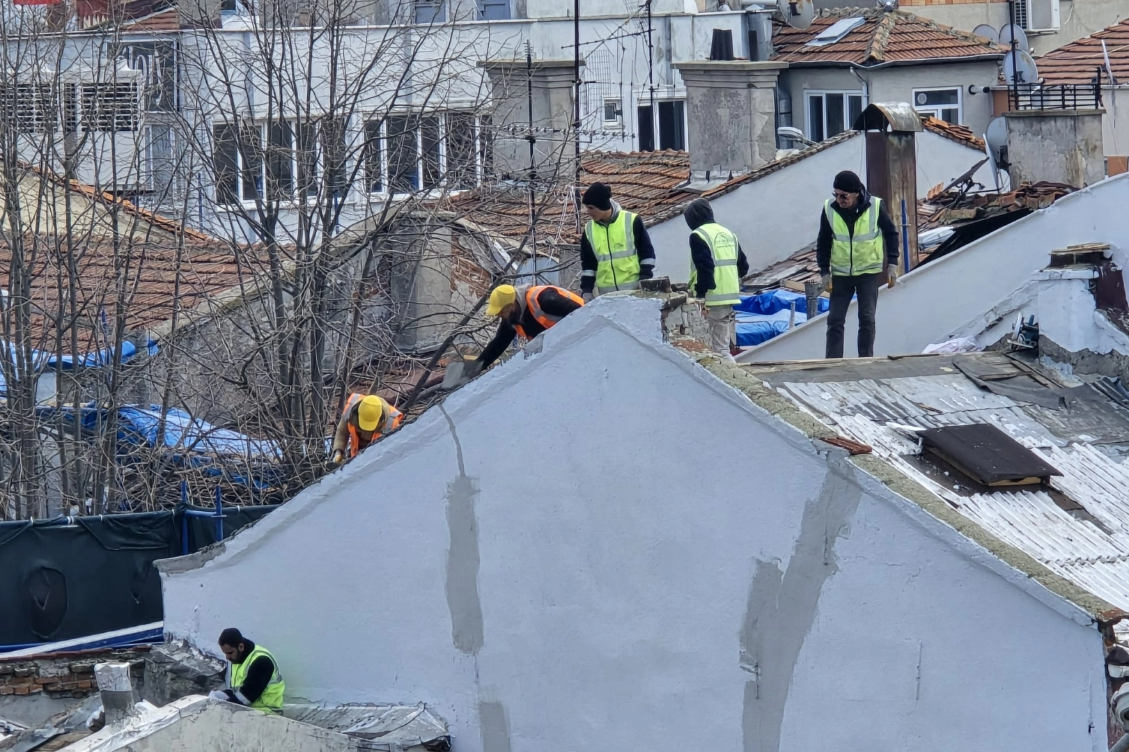 Saraçlar Caddesi’nin girişinde bulunan binaların çatısında çalışmalar gerçekleştiren ekiplerin, hiçbir güvenlik önlemi almadan çalışması dikkatleri çekti. Görevleri gereği birçok yenileme uygulaması yapan ekipler, binanın çatısında gerçekleştirdiği çalışmalarda hiçbir güvenlik önlemi almadan çalışıyor. Eğimli yüzeyde çalışma gerçekleştirilmesine rağmen herhangi bir koruma önlemi almadan çalışan personel, kazaya davetiye çıkarıyor.