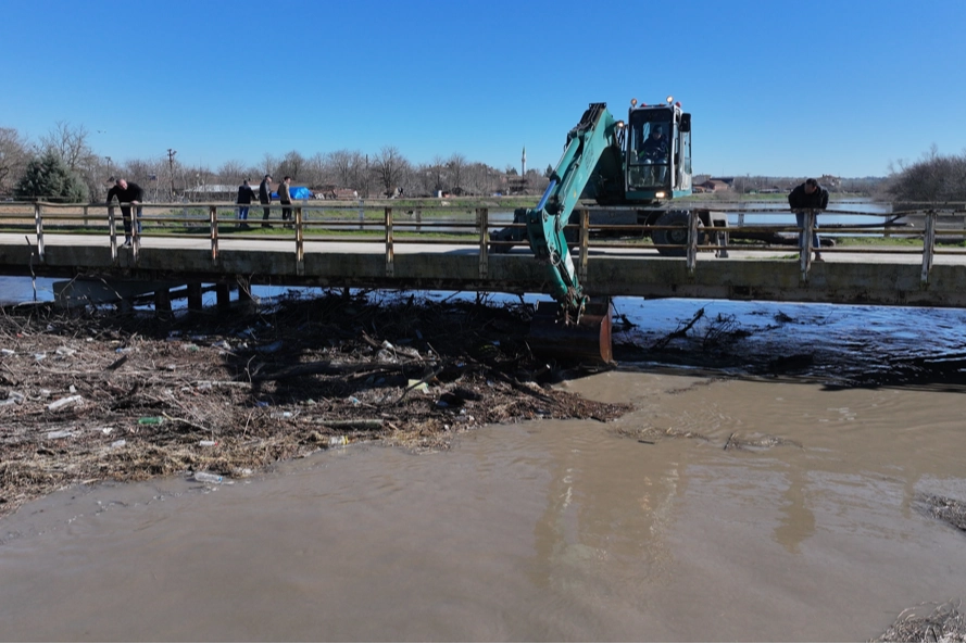 Tunca Nehri üzerindeki Değirmenyeni Köprüsü’ne giden ekipler, köprü ayağında biriken ağaç gövdelerini nehirden çıkardı, çöpleri de temizledi.