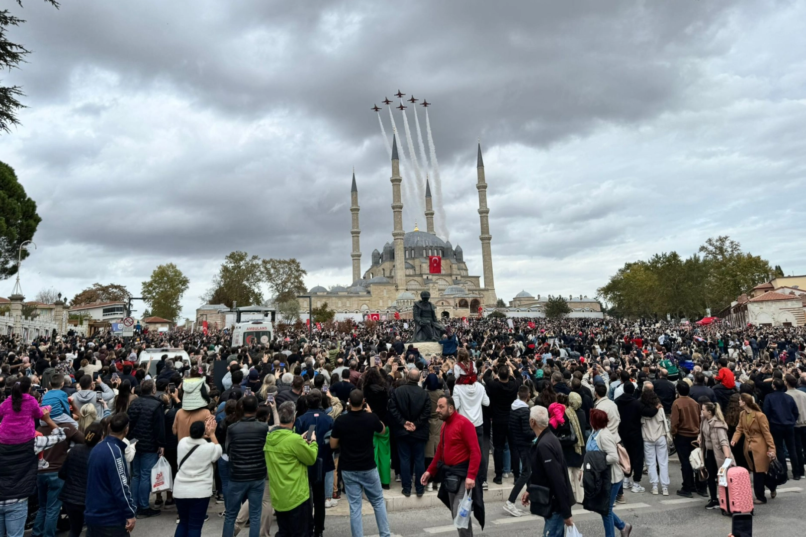 Türk Hava Kuvvetleri'nin akrobasi timi Türk Yıldızları, Edirne’de gösteri uçuşu gerçekleştirdi. Türk Yıldızları’nın nefes kesen gösterisini izlemek isteyen Edirneliler, saatler öncesinden Selimiye Camii meydanında yerini aldı.