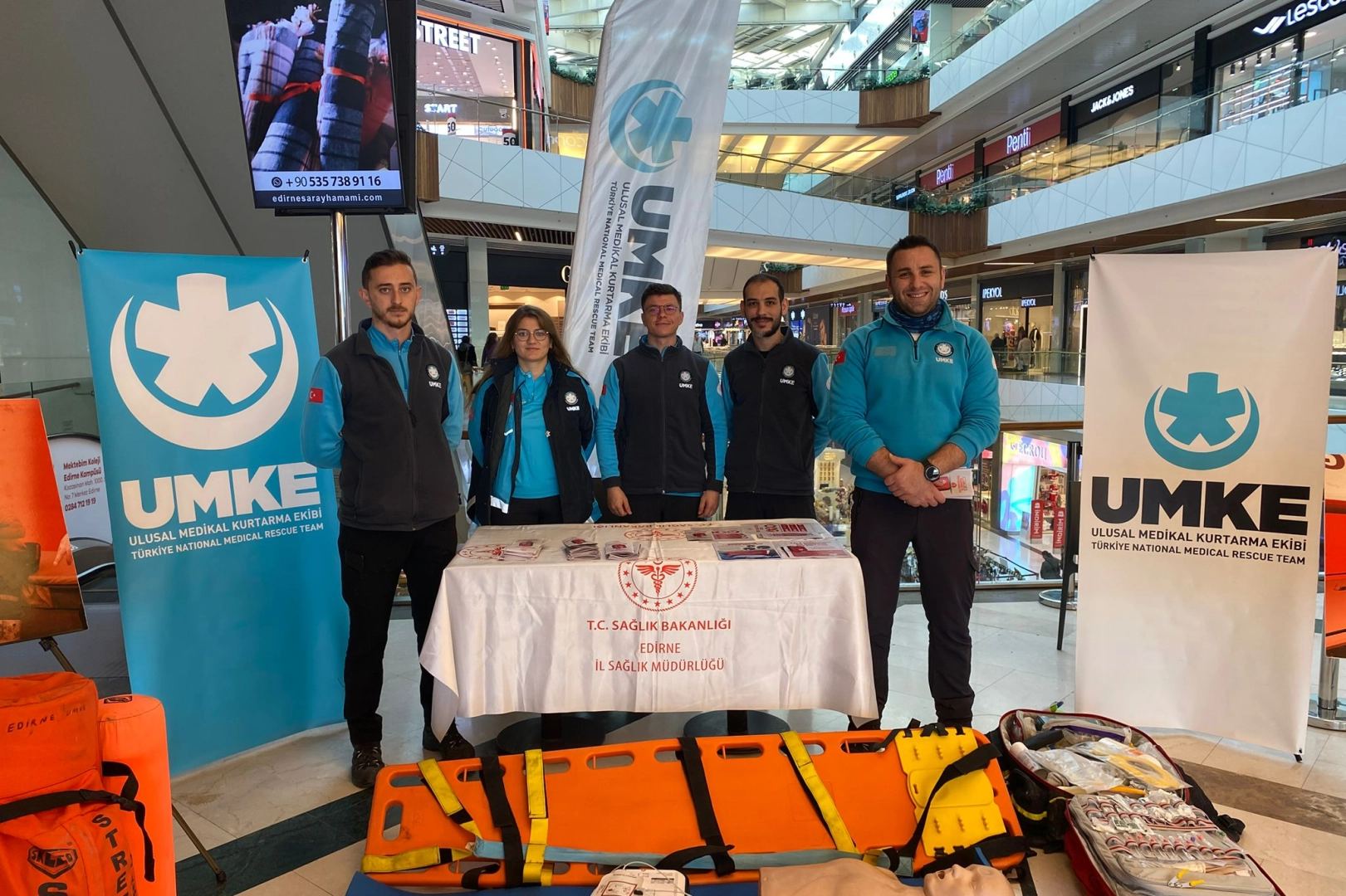 Edirne İl Sağlık Müdürlüğü’ne bağlı Ulusal Medikal Kurtarma Ekibi (UMKE), kentteki bir alışveriş merkezinde stant açarak vatandaşlara acil durumlarda yapılması gerekenlerle ilgili bilgilendirme yaptı.