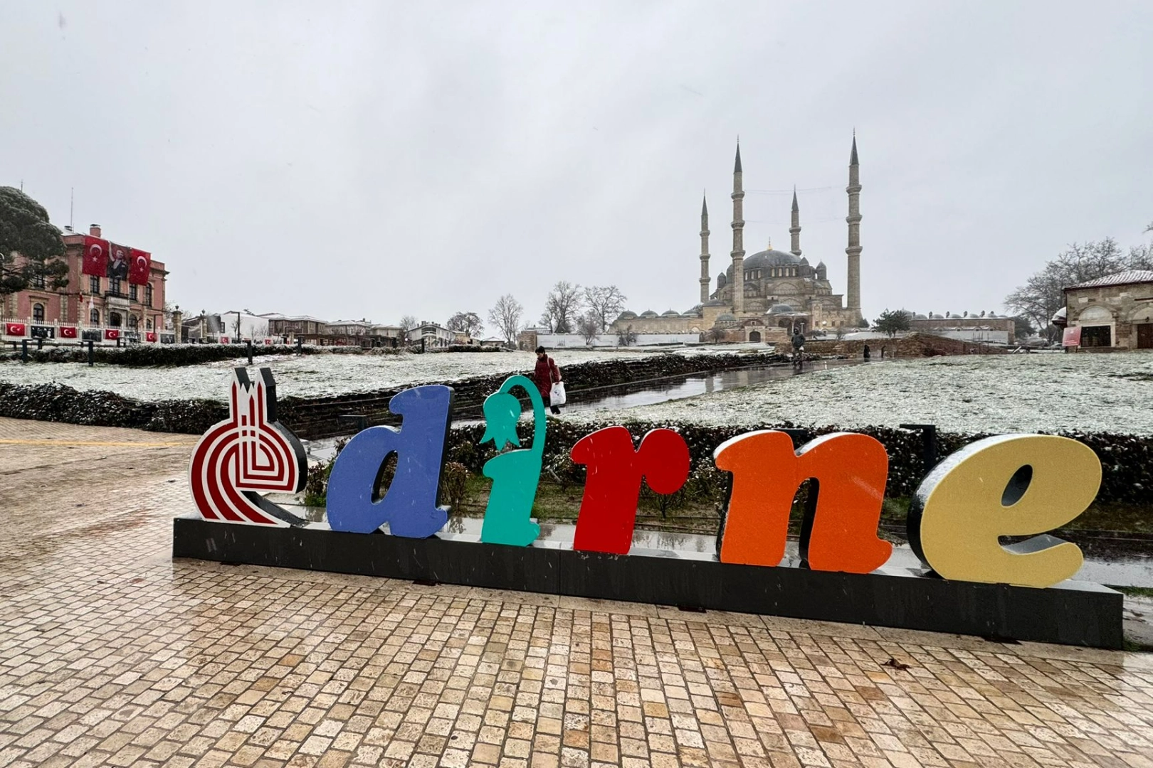 Meteorolojinin uyarılarının ardından Edirne’de beklenen soğuk hava dalgası etkisini gösterdi. Öğle saatlerinde başlayan sağanak yağış, sıcaklığın ani düşüşüyle birlikte yerini kar yağışına bıraktı. Özellikle tarihi mekanların bulunduğu bölgelerde kar yağışı etkisini artırdı.
