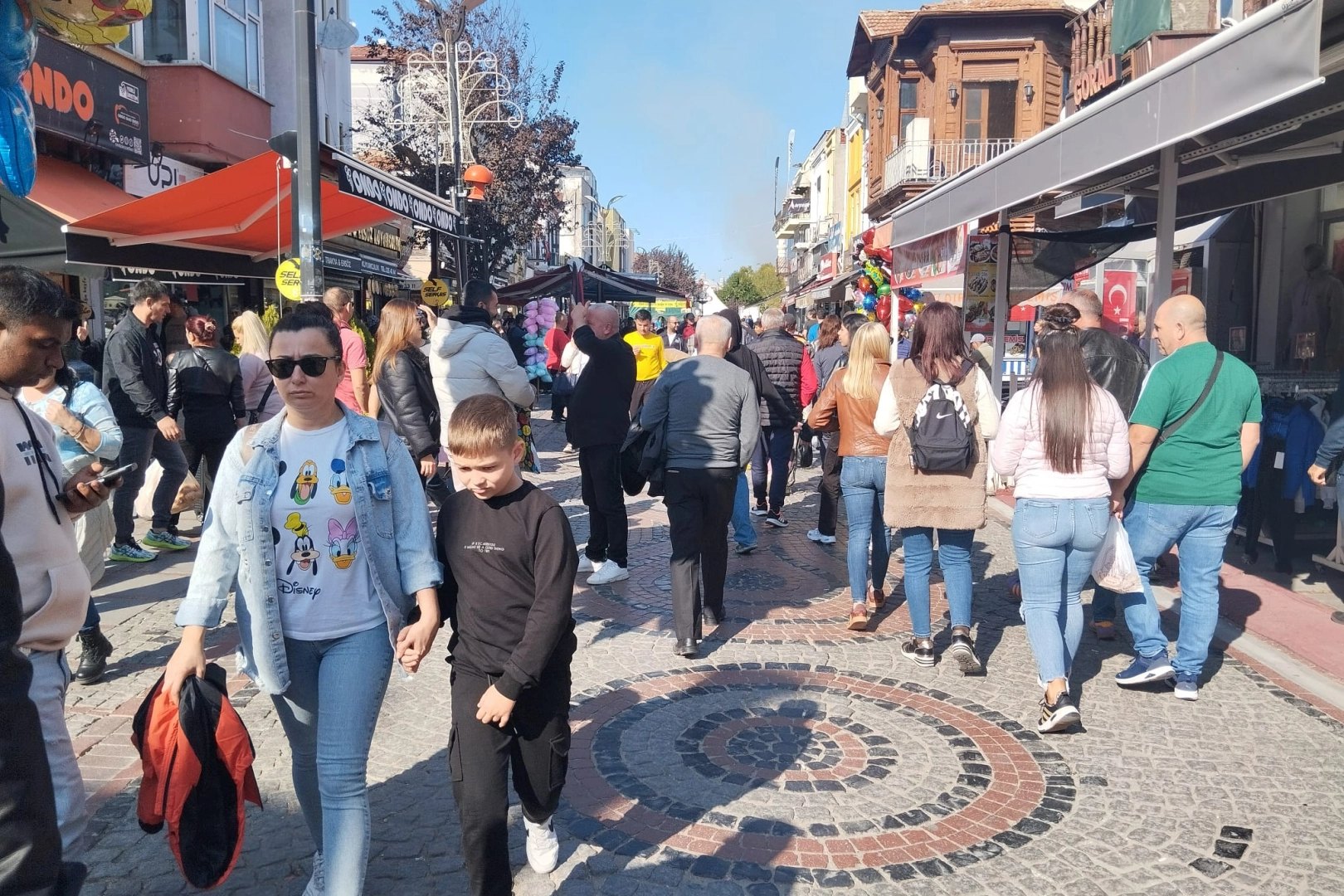 Edirne’de Ekim ayı gelmesine rağmen, özellikle öğleden sonraları görülen sıcak hava bugün çarşı merkezde kalabalıklar oluşmasını sağladı. Havanın güneşli ve sıcak olmasına, Cumartesi gününün tatil olması ve Bulgar turistlerin ziyaretleri de eklenince özellikle Saraçlar caddesinde yoğunluk arttı. Termometrelerin 29 dereceyi gösterdiği Edirne’de vatandaşlar, kış soğukları başlamadan önce güneşli ve sıcak havanın tadını çıkardılar.