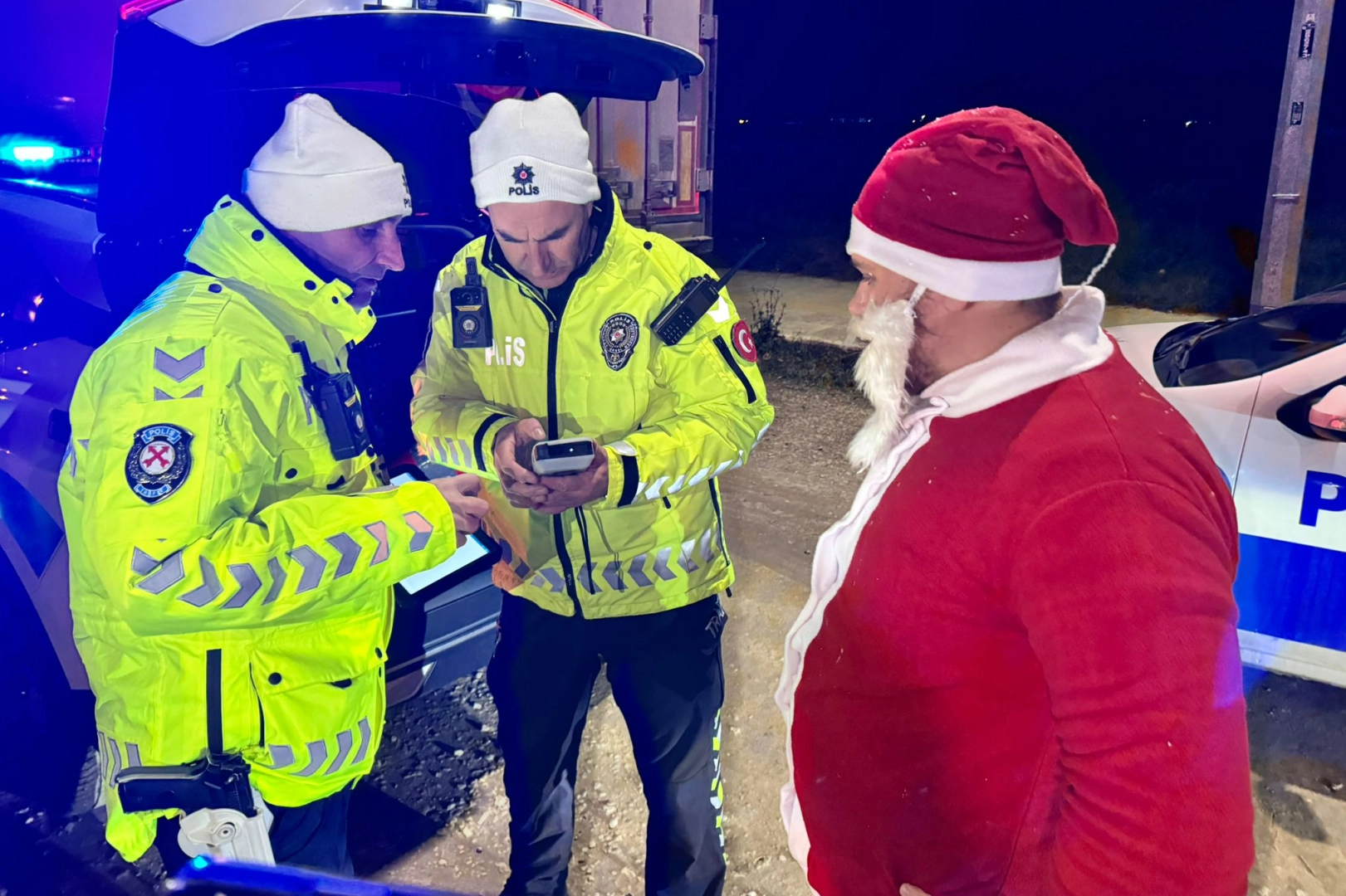 Yılbaşı kutlamaları kapsamında Noel Baba kostümü giyerek trafiğe çıkan bir sürücü, polis ekiplerince durduruldu. Ehliyet ve ruhsat kontrolü yapılan sürücünün alkol metreye üflediği anlar çevredeki vatandaşlar tarafından ilgiyle izlendi.
