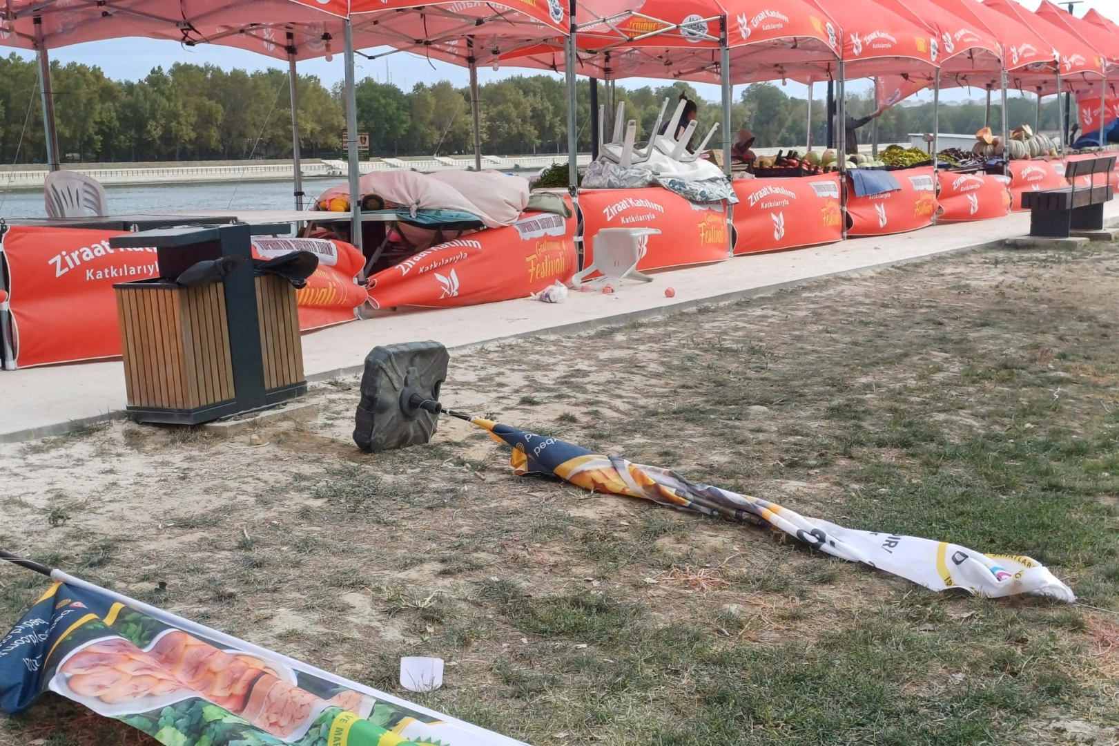Edirne'de Söğütlük Millet Bahçesi'nde düzenlenen “Yaşayan Miras ve Topraktan Sofraya Edirne Gastronomi Festivali” rüzgarlı havadan olumsuz etkilendi. Sabah saatlerinde stantlarını açmak için gelen yöresel ürün stant sahipleri, stantlarının rüzgara kapılmaması için savaş verdi