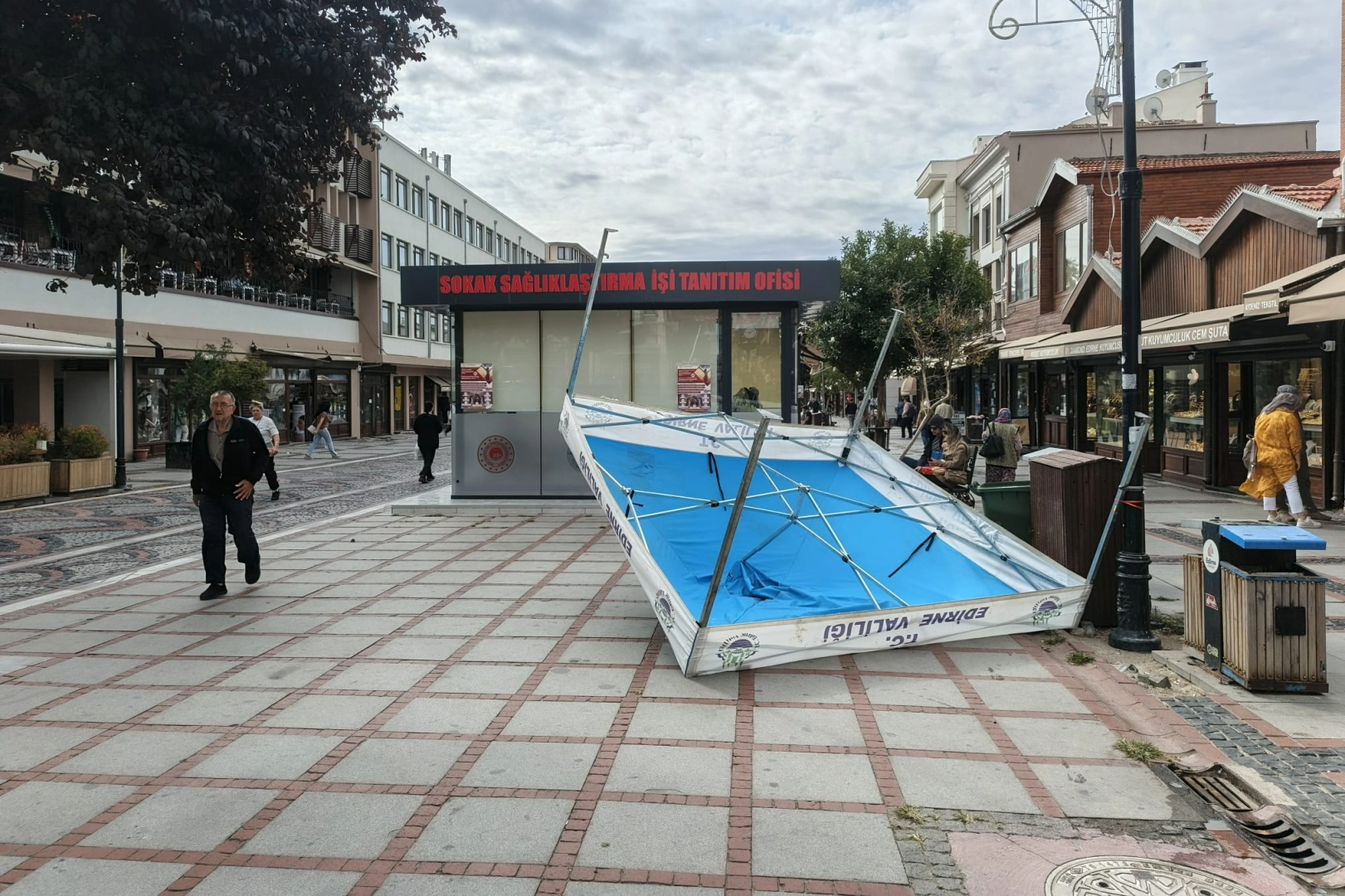 Kentin en yoğun caddelerinden olan Saraçlar Caddesi'nde Edirne Valiliği'ne ait bir çadırın ise rüzgarın etkisiyle devrilmesi dikkat çekti.