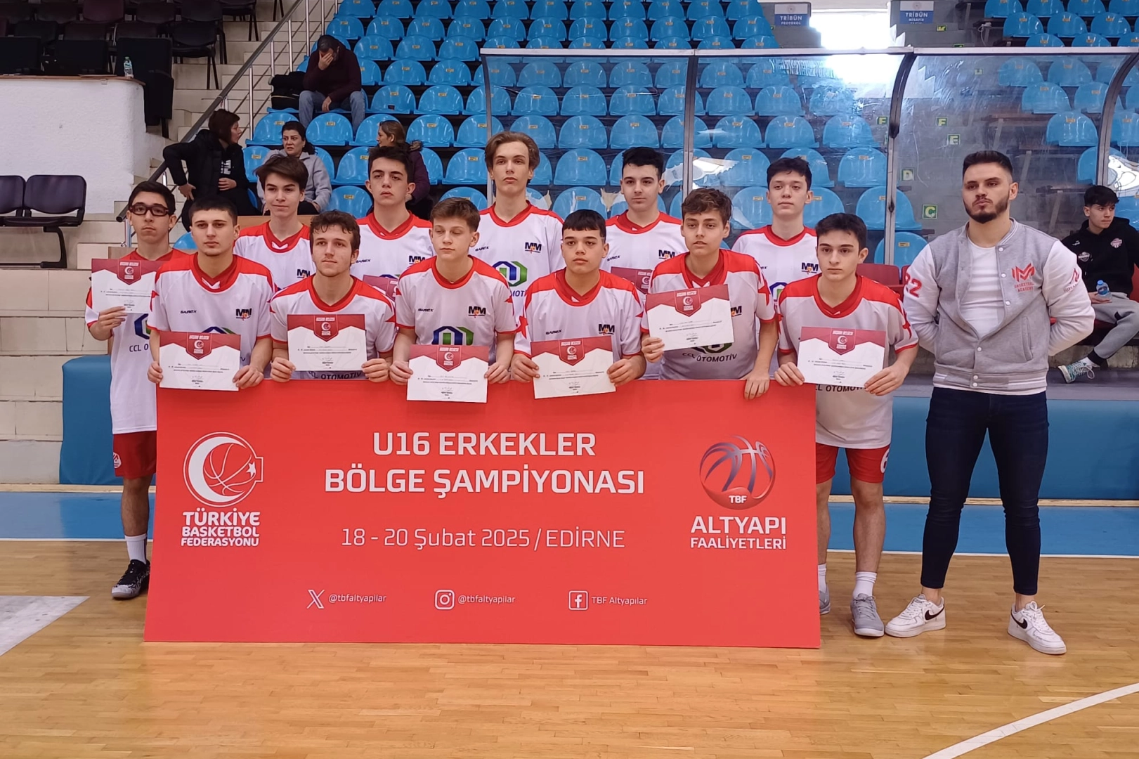 Edirne Mimar Sinan Spor Salonu’nda gerçekleştirilen U-16 Erkekler Bölge Basketbol Şampiyonası’nda Edirne M&M Akademi, bugün Kırklareli Gençlik ile karşı karşıya geldi. maç içerisinde 10 sayılık farktan son periyotta geri dönen Edirne ekibi son saniye 3’lüğü ile maçı 55-55’e getirerek maçı uzattı. Beş dakikalık uzatma periyodunda iki takımın inanılmaz mücadelesi gözler önüne serilirken, maçı Kırklareli Gençlik 66-63 kazandı. Karşılaşma sonrası federasyon temsilcisi tarafından iki takıma da katılım belgesi takdim edildi.
