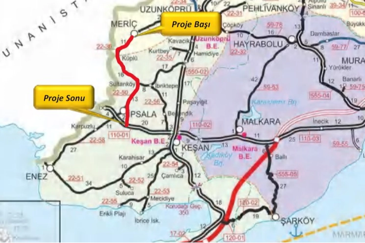 Dosyaya göre planlanan yolun toplam uzunluğu 41 bin 755 metre. Yapılacak proje ile mevcut yolun şerit sayısı korunacak ve platform genişliği 12 metreye yükseltilecek. Proje güzergahı, Meriç ilçe merkezinin yaklaşık 1,5 km güney yönünden, Meriç-İpsala Yolu’nda başlayacak ve D110 (Tekirdağ-Keşan-İpsala) Karayolu’na bağlanarak sona erecek.