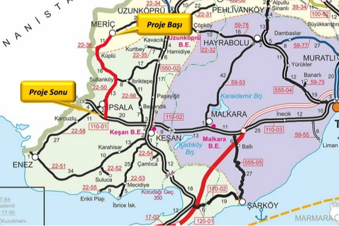 Projenin tüm etüt ve proje çalışmalarının tamamlanmasının ardından inşaat çalışmalarına başlanacağı belirtilen dosyada, yaklaşık 2 yıllık sürede inşaat çalışmaların tamamlanarak yolun tekrar işletmeye alınmasının planlandığı ifade edildi. Meriç ilçe merkezinin 1,5 km güneyindeki mevcut Meriç-İpsala Yolu üzerinden başlayacak projede, Kadıdondurma köyü girişi için bağlantı yolu yapılacak. Subaşı yerleşimine giriş için K-1 kavşağı, Büyükaltıağaç yerleşimi ile bağlantı sağlamak için K-2 kavşağı, Subaşı yerleşiminden çıkış için ise K-3 kavşağı, Küplü yerleşimine bağlantı sağlanması amacıyla (giriş) Küplü Kavşağı, Küçükaltıağaç yerleşimi ile bağlantı sağlamak için K-5 kavşağı, Küplü yerleşiminden çıkış için ise K-6 kavşağı planlanan projede, Km:14+000 ile Km:17+200 arasında Ergene Nehri geçişi için 2 farklı güzergâh alternatifi projelendirildi. İlk alternatif güzergâh, Ergene Nehri üzerinde bulunan mevcut köprü korunarak geçilen hat, ikinci alternatif güzergâh ise Ergene Nehri üzerine 600 metre uzunluğunda yeni köprü yapılarak yatay hattın standartlarını yükseltilerek geçilen hat olacak. Her iki güzergâh Km:17+200’de birleşerek tek hat halinde devam edecek. Balabancık yerleşimini geçen güzergâh olan Km:23+100’nin de mevcut hatta oturduğu ifade edilen dosyada, bu kesimde Sultan ve İbriktepe yerleşimlerine bağlantı sağlanması amacıyla kavşakların tesis edileceği belirtildi. Güzergâh Km:27+200 civarında ise mevcut hat üzerine oturarak devam ettiği açıklanan dosyada, bu kesimde su geçişlerine müsaade edecek menfez yapılarının tesis edileceği ve Km:32+895’de Sarıcaali yerleşime bağlantı sağlanması amacıyla bir kavşak planlandığı ifade edildi.