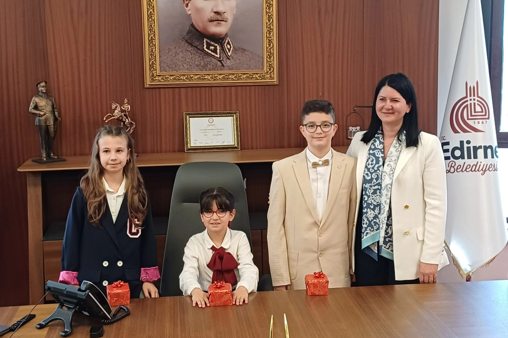 Edirne'de bugün 23 Nisan Ulusal Egemenlik ve Çocuk Bayramı kutlamaları kapsamında Edirne Belediye Başkanı Filiz Gencan Akın, makamını miniklere bıraktı.