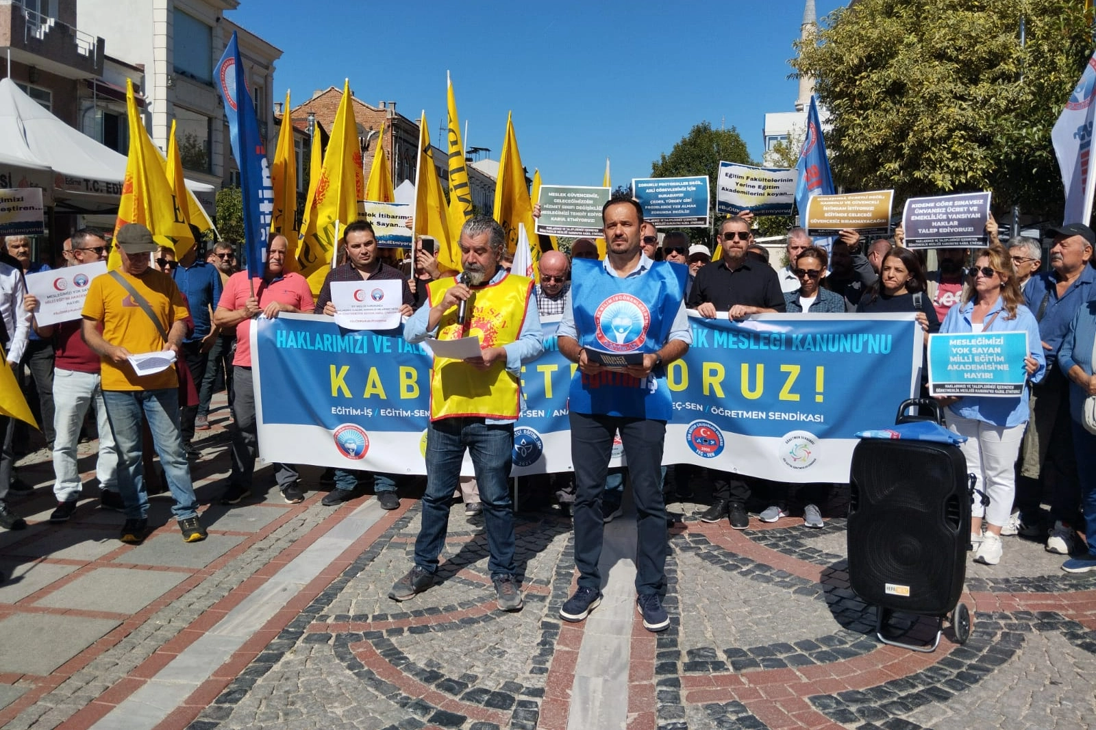 Eğitim-İş Edirne Şube Başkanı Nedim Zobar ve Eğitim-Sen Edirne Şube Başkanı Ahmet Acet’in birlikte okudukları, “ÖMK’ye yönelik eleştiri ve önerilerimizin ısrarla görmezden gelinmesi bizler açısından kabul edilemez bir durumdur” denilen açıklamanın devamında; “Millî Eğitim Bakanlığı’nın (MEB), eğitimin bileşenlerinin görüşlerini almadan masa başında hazırladığı ÖMK geçtiğimiz yasama dönemi sonunda TBMM Genel Kurulu’nda görüşülmeye başlanmış ve kanunun ilk 22 maddesi bütün eleştiri ve itirazlara rağmen kabul edilmiştir. Eğitimin ana bileşenlerinden birisi olan eğitim ve bilim emekçilerini yok sayan, taleplerine ısrarla kulak tıkayan MEB, sürecin başından bu yana bildiğini okumaya devam etmeyi sürdürmektedir. Eğitim sendikalarının, halen görevde olan ve atama bekleyen bir milyonu aşkın öğretmenin taleplerini yok sayan ÖMK’ye yönelik eleştiri ve önerilerimizin ısrarla görmezden gelinmesi bizler açısından kabul edilemez bir durumdur. Öğretmenlik mesleğini itibarsızlaştıran ve emeğimizi değersizleştiren, ekonomik, sosyal ve mesleki sorunlarımıza çözüm üretmeyen, eşit işe eşit ücret ilkesini ortadan kaldıran, özlük haklarımızı zayıflatan, çalışanlar arasında ayrımcılığı ve eşitsizliği derinleştiren bir içeriğe sahip olan ÖMK’nin TBMM gündemine yeniden geleceği açıklanmıştır. Bugün burada Öğretmenlik Mesleği Kanunu teklifi ile ilgili itirazlarımızı sizlerle paylaşmak için toplandık. Bu teklif, öğretmenlerin mesleki haklarını güvence altına almak bir yana, bizi daha da zor şartlar altına sürükleyecek hükümler içermektedir. Kanuna dair temel itirazlarımız şu şekildedir; Meslek Kanunu tanımı yanıltıcıdır, anayasa mahkemesi kararları göz ardı edilmiştir, unvan ayrımı kabul edilemez, eğitim fakülteleri suçlanıyor, öğretmenlik mesleğini güçlendirmiyor, aksine zayıflatıyor, mesleki güvence yok, güvencesiz istihdam var, öğretmen yetiştirme sistemi değiştiriliyor, öğretmenlerin hakları görmezden gelinmiştir, Milli Eğitim Akademisi’ni kabul etmiyoruz” ifadelerine yer verildi.
