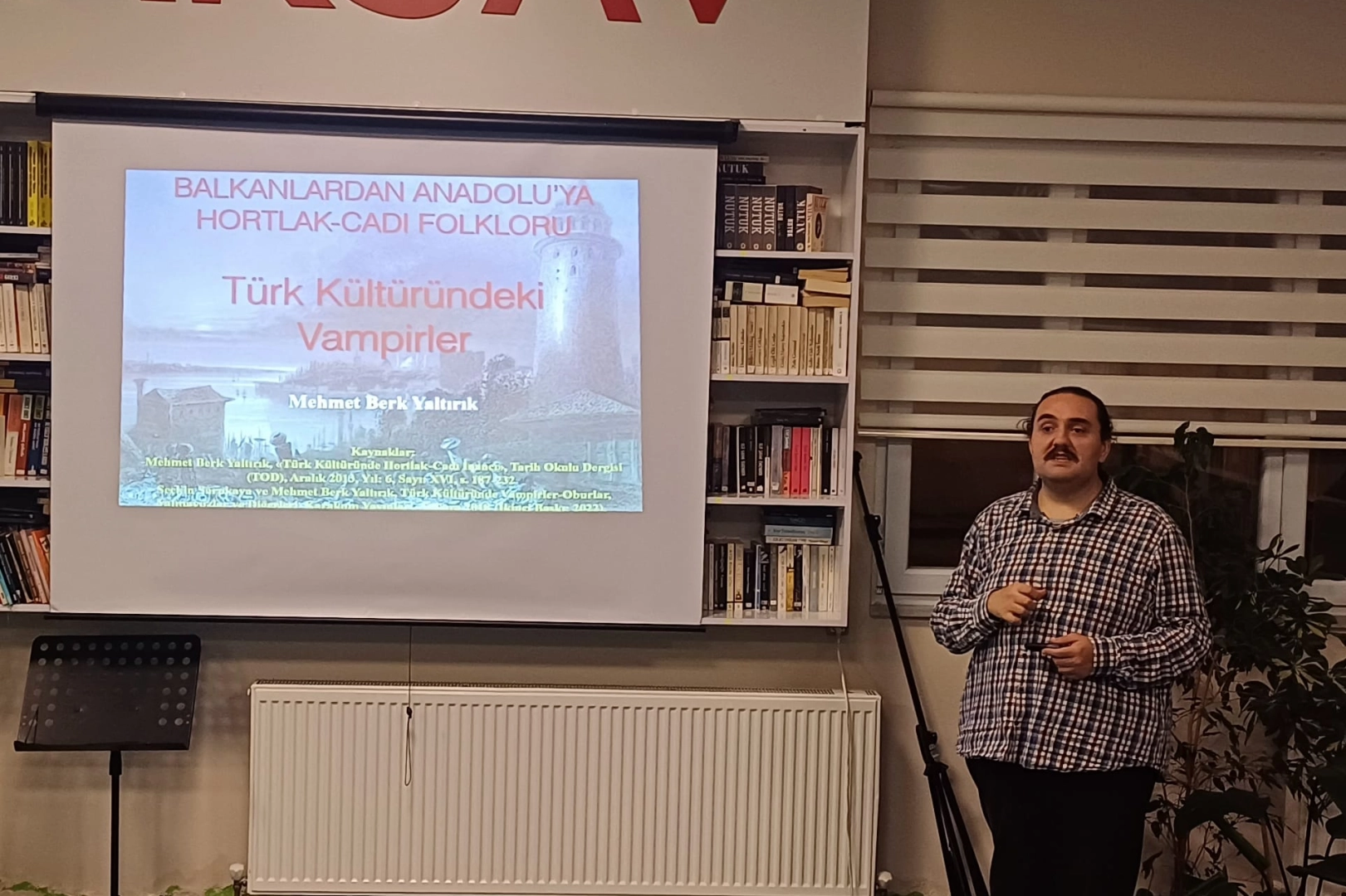 Tarihsel korku anlatıları ve halk kültürü üzerine çalışmalarıyla tanınan Yaltırık, konuşmasında vampir mitinin kökenlerini ve Balkan coğrafyasındaki yansımalarını anlattı. “Vampir anlatısının en yoğun biçimde Balkan coğrafyasında karşımıza çıktığını görüyoruz” diyen Yaltırık, bölgenin kültürel çeşitliliğiyle birlikte bu inancın farklı biçimlerde yaşatıldığını belirtti.