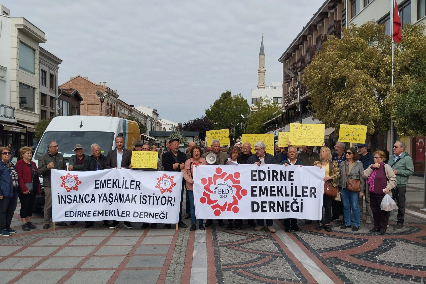 Saraçlar Caddesinde, dernek üyesi Ayşe Çotuk’un okudu basın açıklamasında emeklilerin enflasyon karşısında ezildiği belirtilerek; “Bizler demokrasi mücadelesinden emekli olunmaz diyen Edirne Emekliler Derneği olarak hak verilmez alınır haykırışıyla yine meydanlardayız. Türk-İş'in Eylül 2025 'teki araştırma raporuna göre 4 kişilik bir ailenin sadece sağlıklı beslenmesi için açlık sınırı 27 bin 970 TL, yoksulluk sınırı 91 bin 109 TL olarak açıklanmıştır. Gıda fiyatlarında yüzde 3,17 yükseliş görülürken, mutfak enflasyonu yüzde 41 olmuştur. TÜİK açıklamalarında bile aylık yüzde 3,23 olarak açıklanmıştır. Bu verilere göre et, tavuk, yumurta ve bütün yiyeceklerde, sıvı yağda gözle görülür bir fiyat artışı olurken, emekli ve dar gelirli vatandaşların alım gücü günden güne azalmıştır. En düşük emekli aylığı 16 bin 881 TL hızla erimeye devam etmektedir. Gelir ve gider arasındaki uçurum büyüdükçe emekli ve dar gelirli vatandaşların yaşam kalitesi de giderek düşüyor. Diğer yandan açıklama yapan Çalışma Bakanı; açlıktan sürünen biz emeklileri bir yük olarak görüp, her ay maaşlarımızın düzenli olarak ödendiğini söyleyerek ‘Şükür Edin’ diyor. Sayın bakan, yıllarca çalışarak devlete vergisini ve sosyal güvenlik primlerini düzenli ve eksiksiz ödemiş olan biz emekliler, ülkemizdeki ekonomik koşulların sebebi değildir. Sizin yanlış ekonomi politikanız ülkemizi bu hale getirdi. Ülkemizin kaynaklarını, gelirlerini belirli şirketlere ve iş insanlarına aktardınız. Biz emekliler örgütlenerek taleplerimizi en güçlü şekilde haykıracağız. Unutmayın ki emekliler bir güçtür. Sandıkta ve alanlarda gücümüzü göstereceğiz. Kararlı duruşumuz ve mücadelemiz toplu sözleşmeli sendika hakkımızı alıncaya dek sürecektir” ifadelerine yer verildi.