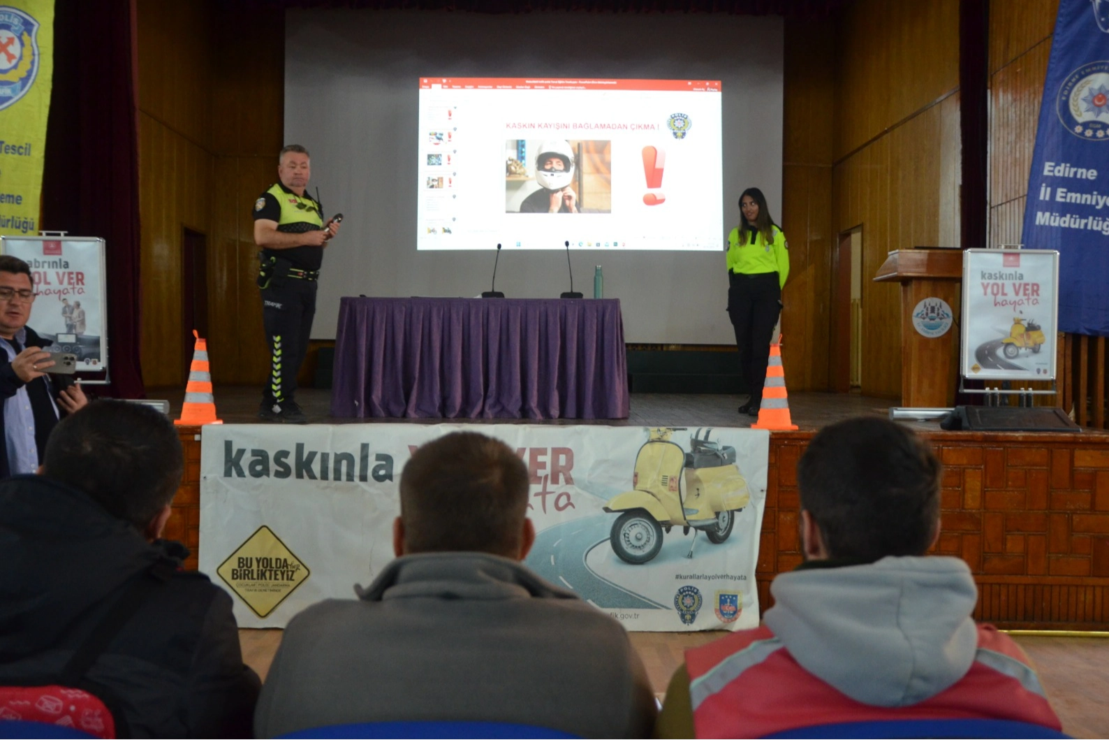 Edirne İl Emniyet Müdürlüğü Trafik Tescil ve Denetleme Şube Müdürlüğü tarafından Halk Eğitimi Merkezinde yapılan eğitim programında motosiklet sürücülerine trafikte nasıl daha güvenli bir şekilde seyir edebilecekleri konusunda önemli ipuçları verdi. Özellikle hız limitlerine uyma, trafik kurallarına riayet etme ve sürüş sırasında dikkatli olmanın önemi vurgulandı.