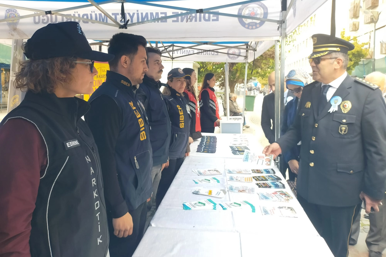 Stantlara gelen vatandaşlarla görüşen Edirne İl Emniyet Müdürü Onur Karaburun, çocuklara çeşitli hediyeler verirken, yetişkinlere de polis rozeti taktı.