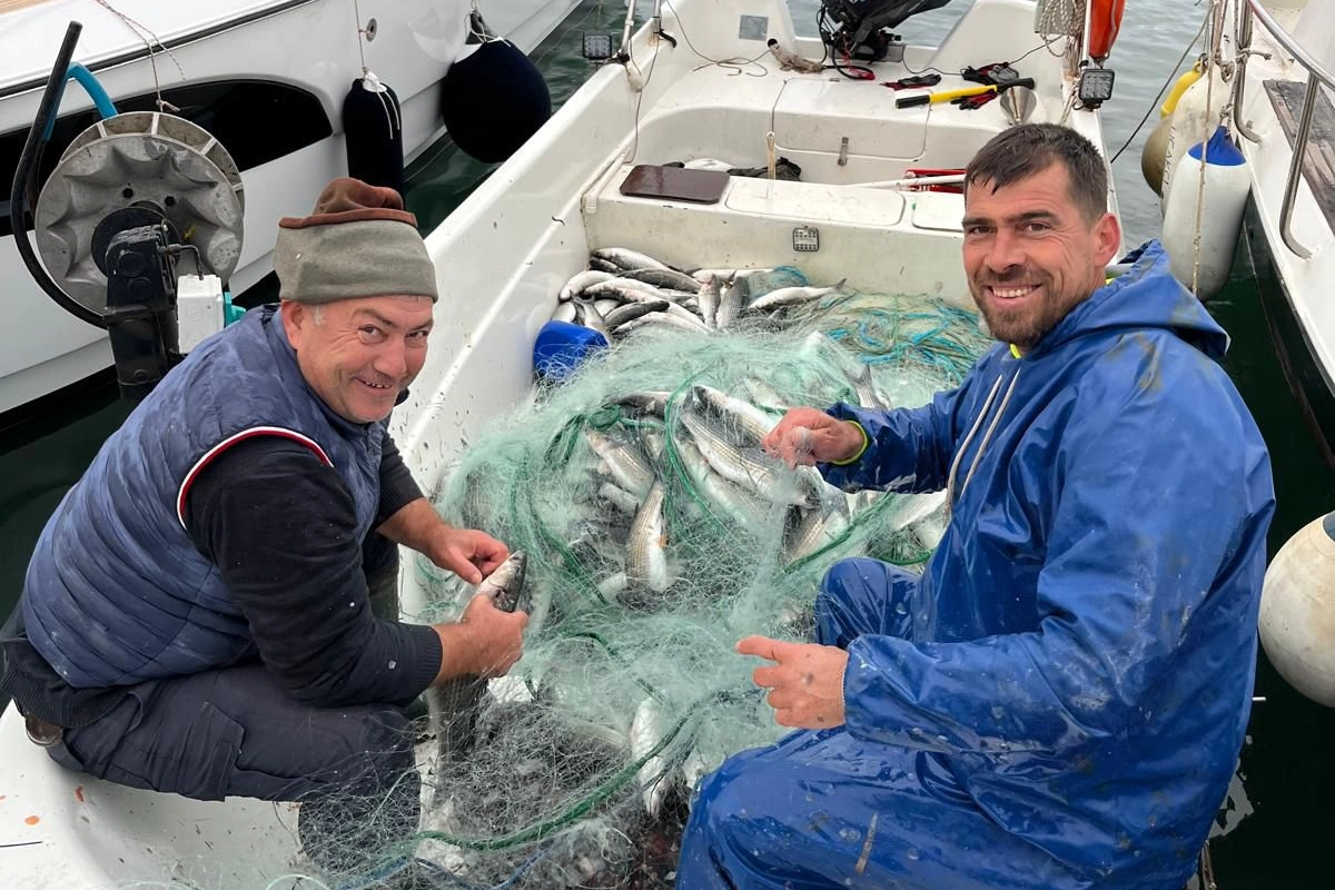 İlçede etkili olan sağanağın ardından denize ağlarını atan balıkçılar Çağrı Engin ve İsmail Yeni, bol miktarda kefal yakaladı.