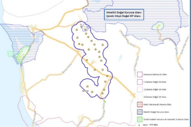 Projede, 2 bin 485,52 hektarlık santral sahası içerisinde kurulması planlanan türbin yerlerinden 18 adet türbin yeri orman parselleri, 6 adet türbin yeri (T17, T19, T20, T21, T22 ve T23) tarla parselleri ve 1 adet türbin yeri (T24) ise tapulama harici alan üzerinde kalıyordu. Korunan Alanlar Haritasına göre de Küçükevren RES ve EDT Santral Sahası içerisinde kurulması planlanan T1, T2, T6 ve T7 numaralı türbin yerleri, Meriç Deltası Sulak Alanı sınırlarında; Tabiat Varlıkları Haritasına göre ise T1 numaralı türbin yeri Çandır Köyü Doğal SİT Alanı sınırlarında kalıyordu.