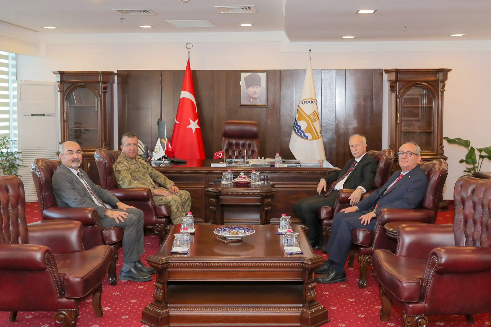 Trakya Üniversitesi’ni (TÜ) ziyaret eden Edirne Garnizon Komutanı Tuğg. Yüksel Kolcu, TÜ Rektörü Prof. Dr. Mustafa Hatipler’i görevi sebebiyle kutladı, TÜ yönetimine başarı dileklerinde bulundu. Tuğg. Yüksel Kolcu’nun bu ziyaretinde, Rektör Yardımcıları Prof. Dr. A. Muzaffer Demir ve Tıp Fakültesi Dekanı Prof. Dr. Sedat Üstündağ da hazır bulundu.