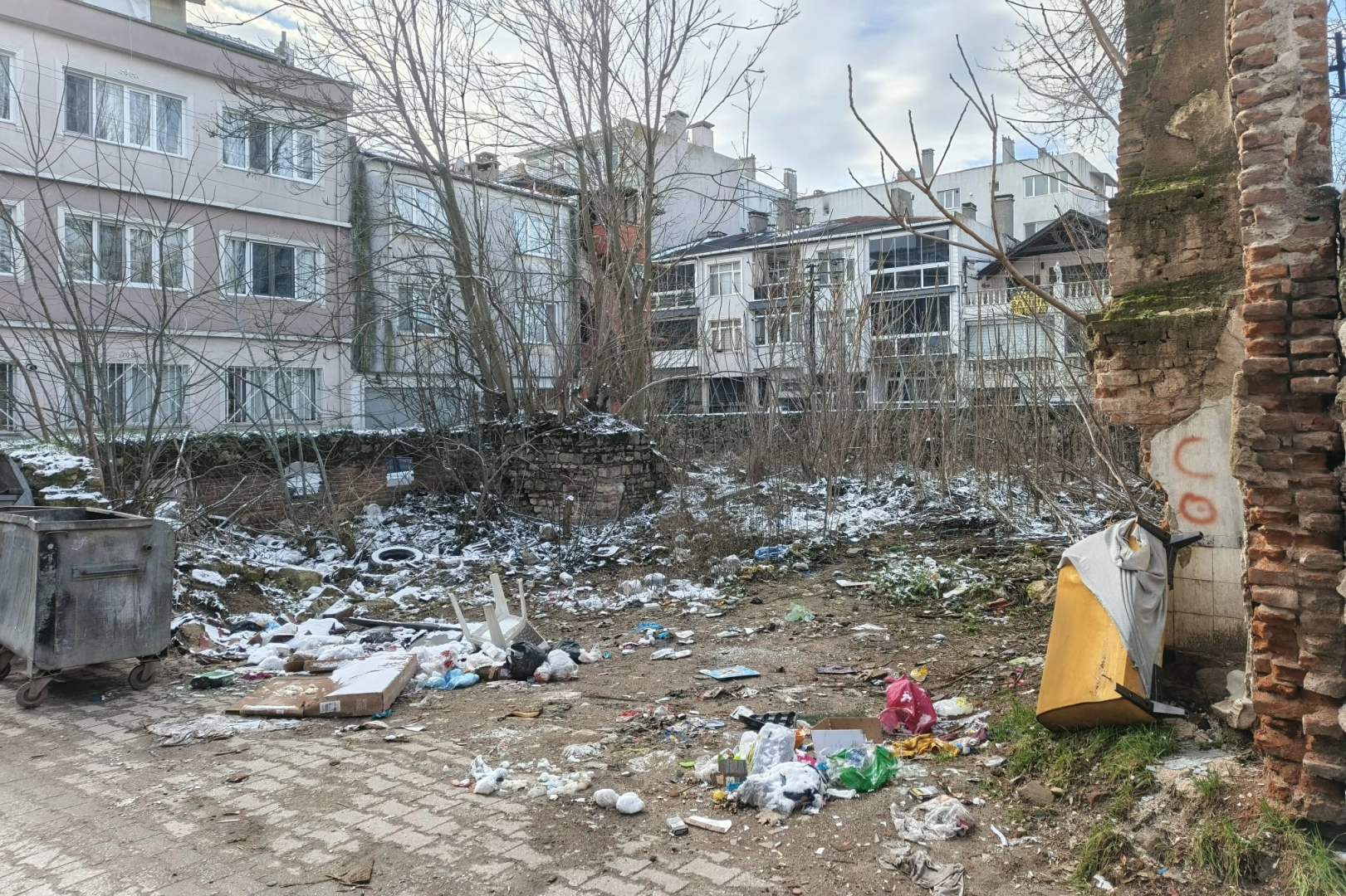 Duvarlarının etrafında çok sayıda çöp konteyneri olsa da insan eliyle atılan çöpler ve ev eşyaları nedeniyle bahçesi adeta çöplüğe dönüşmüş durumda. Kentteki gözden uzakta kalan ara bir sokakta geleceğe aktarılamayan bir miras olarak kalan alanda yıllardır herhangi bir çalışma yapılmaması da dikkat çekiyor.