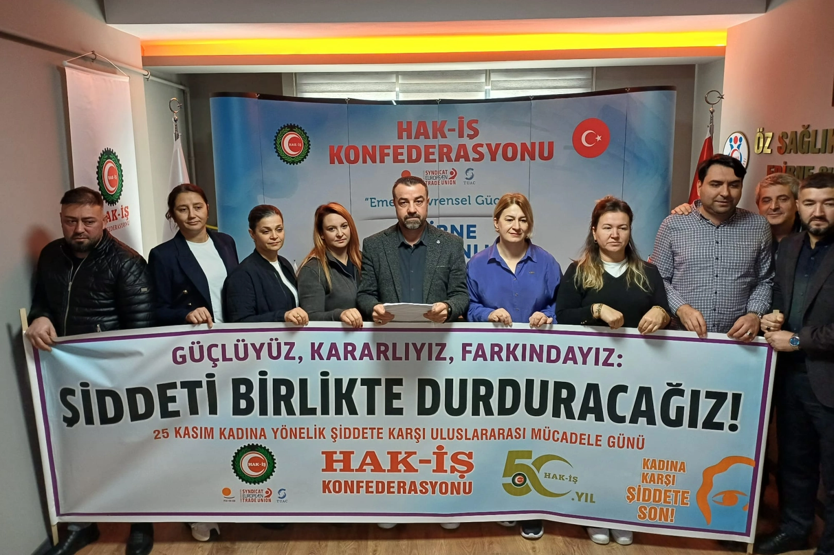 Edirne’de bugün kadına yönelik şiddetle mücadele kapsamında Hak-İş Konfederasyonu Edirne İl Başkanı Emre Promet başkanlık binasında açıklama yaptı. Promet, kadına yönelik şiddetin yalnızca bireysel bir sorun değil, küresel bir insanlık krizi olduğuna dikkat çekti.