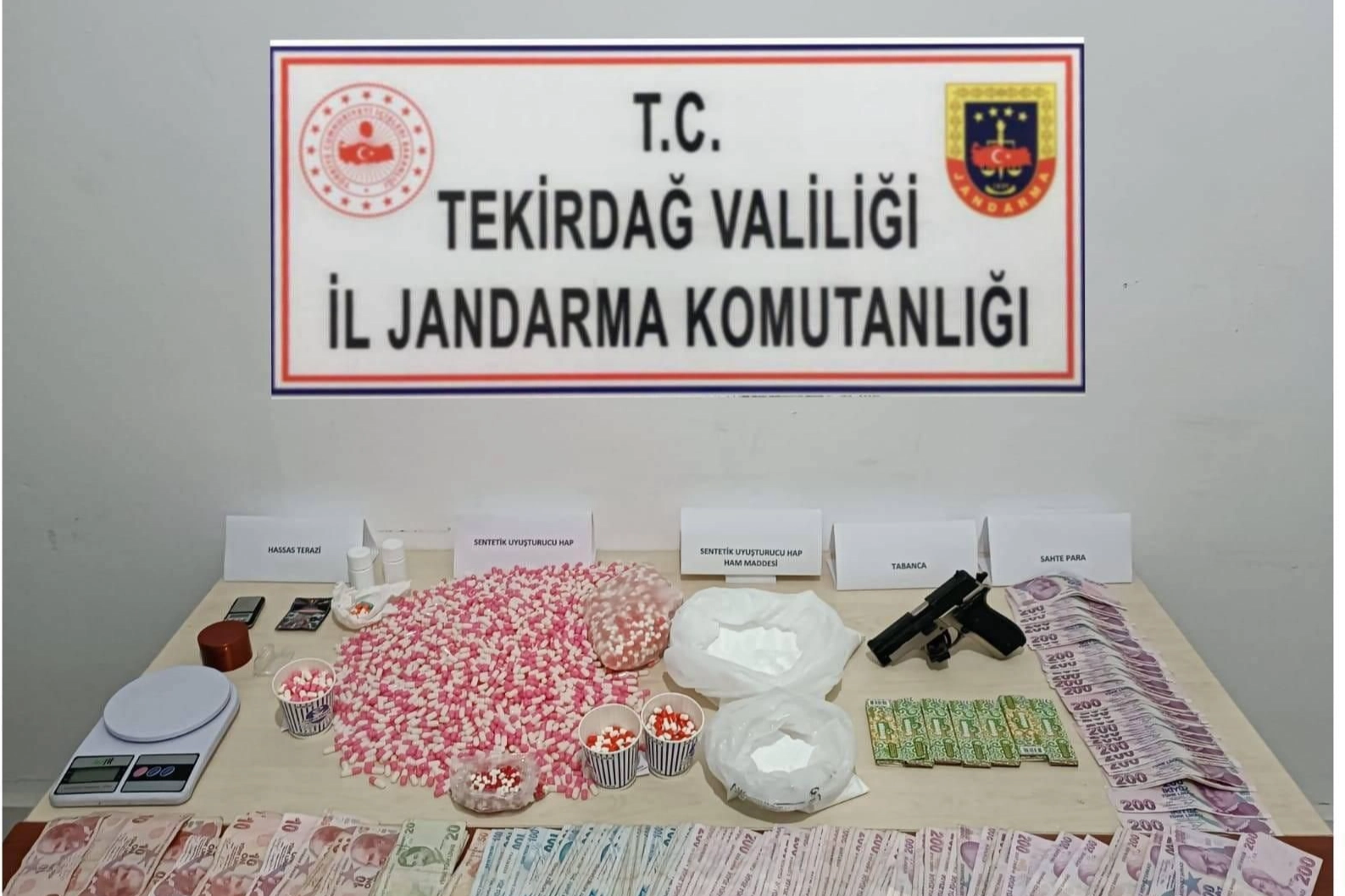 Tekirdağ İl Jandarma Komutanlığı ekipleri, İstanbul’daki bir ilaç fabrikasında çalışan E.S.’nin, çaldığı ham maddelerle Tekirdağ'ın Saray ilçesindeki evinde uyuşturucu hap ürettiği yönünde bilgiye ulaştı. Bunun üzerine evine operasyon düzenleyen ekipler, 33 bin uyuşturucu hap, 2 bin boş hap kapsülü ve 50 adet sahte 200 TL’lik banknot ele geçirdi. E.S. ile birlikte uyuşturucu satışı yaptığı tespit edilen B.A., H.İ. ve H.E. gözaltına alındı. Jandarmadaki işlemlerinin ardından adliyeye sevk edilen 4 şüpheli çıkarıldıkları mahkemece tutuklanarak cezaevine gönderildi.
