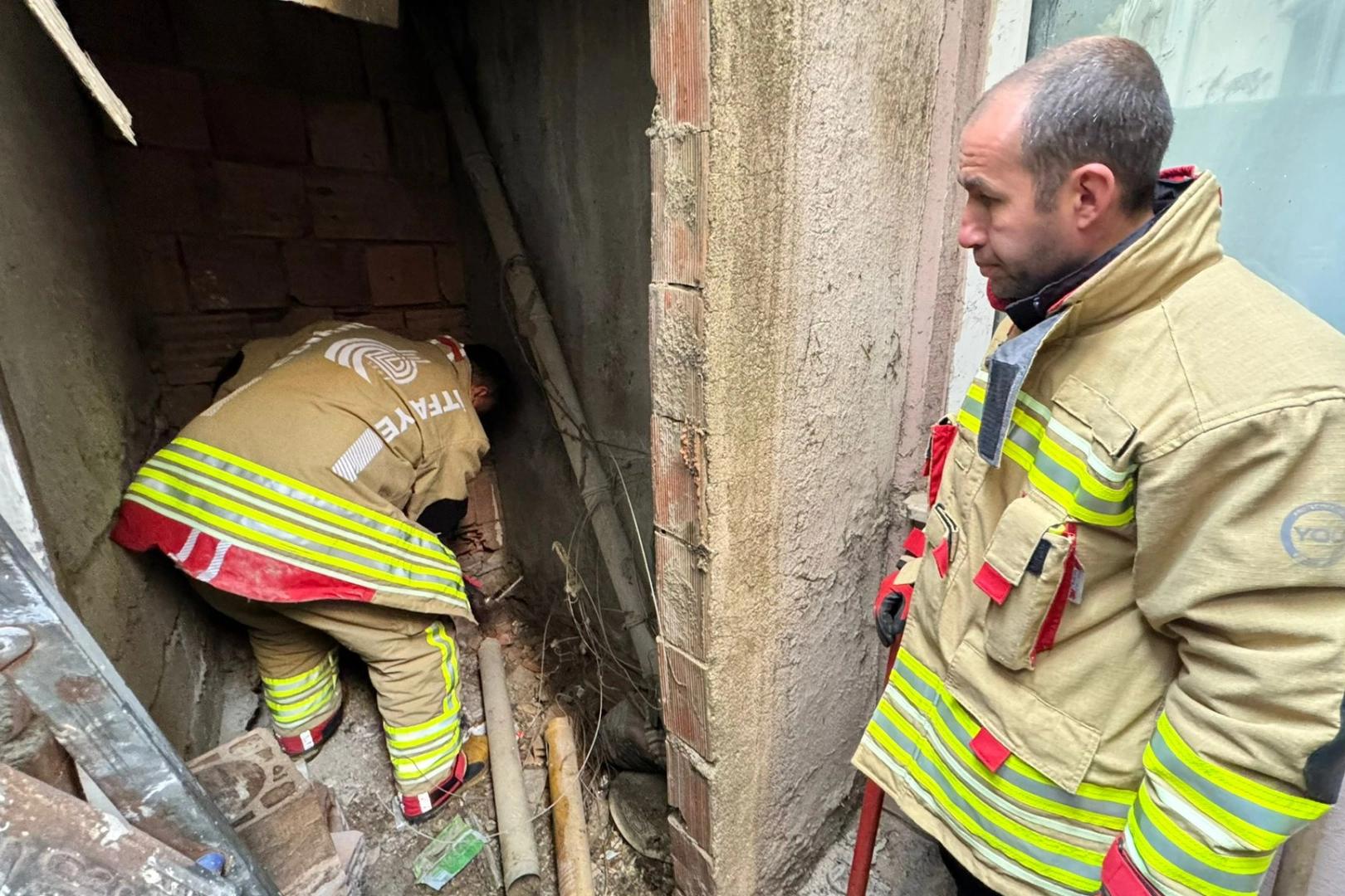 İTFAİYEDEN ‘NEFES’ OPERASYONUKısa sürede olay yerine gelen itfaiye ekipleri, kedinin mahsur kaldığı dar alanda zarar görmemesi için hassas bir çalışma başlattı. Kurtarma planı çerçevesinde, duvarın bir kısmının kırılmasına karar verildi. Ekiplerin titiz müdahalesiyle açılan bölümden alınan kedi, sağlıklı bir şekilde sahibine teslim edildi.