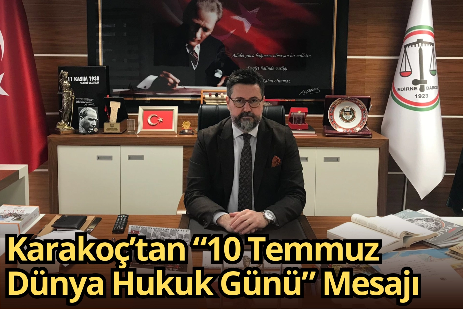 Edirne Barosu Başkanı Av. Gökhan Karakoç, 10 Temmuz Dünya Hukuk Günü dolayısıyla yayımladığı mesajda, hukukun toplumsal barış, adalet ve insan onurunun güvencesi olduğunu vurguladı. Karakoç, yargıya duyulan güvenin zedelenmesine dikkat çekerek hukukun siyasallaşmasının tehlikelerine işaret etti.